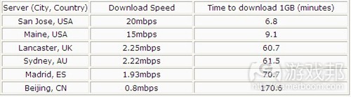 基于标准的下载速度,以下是不同地区的服务器在下载1GB内容所需要的时间:
