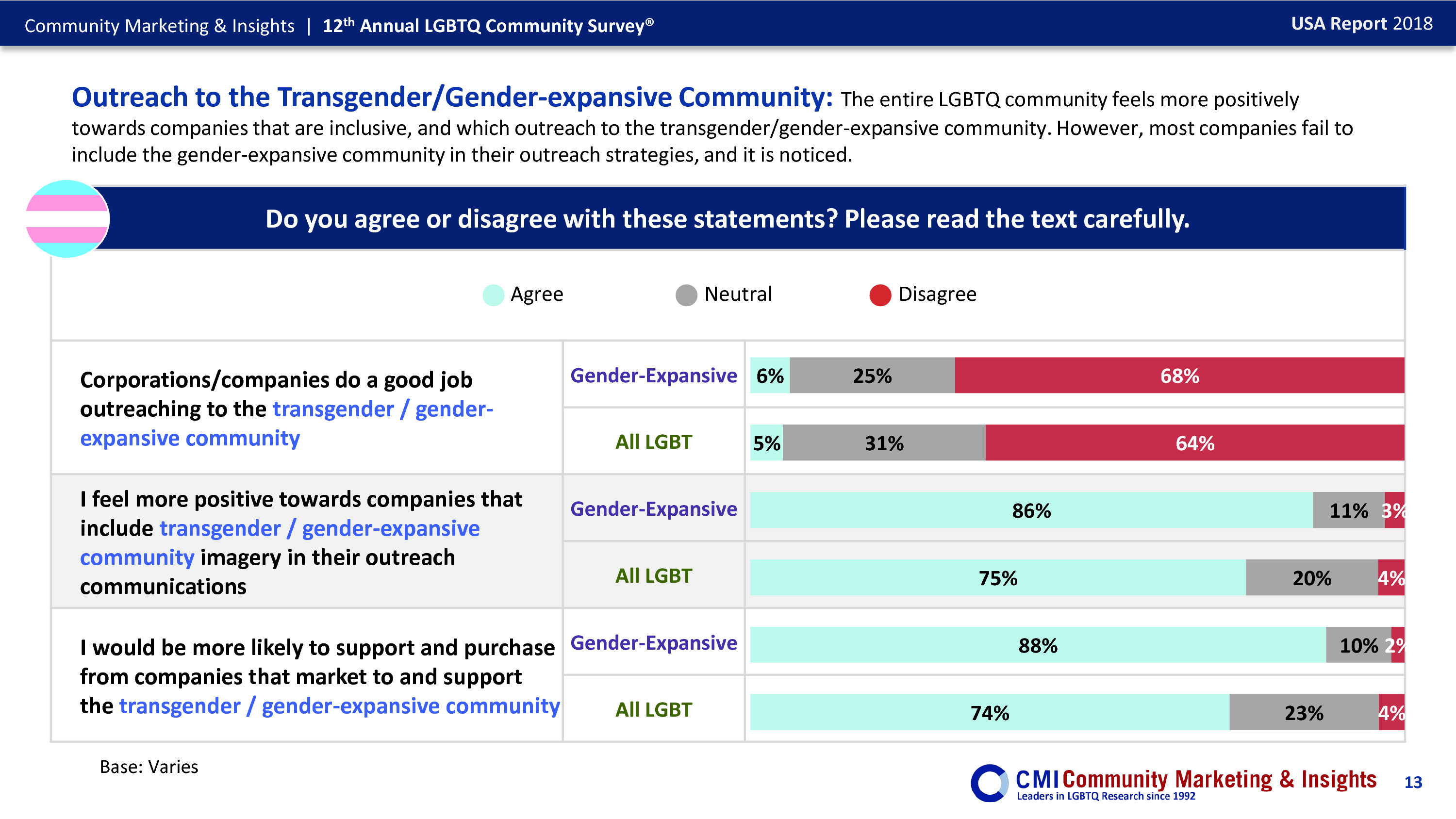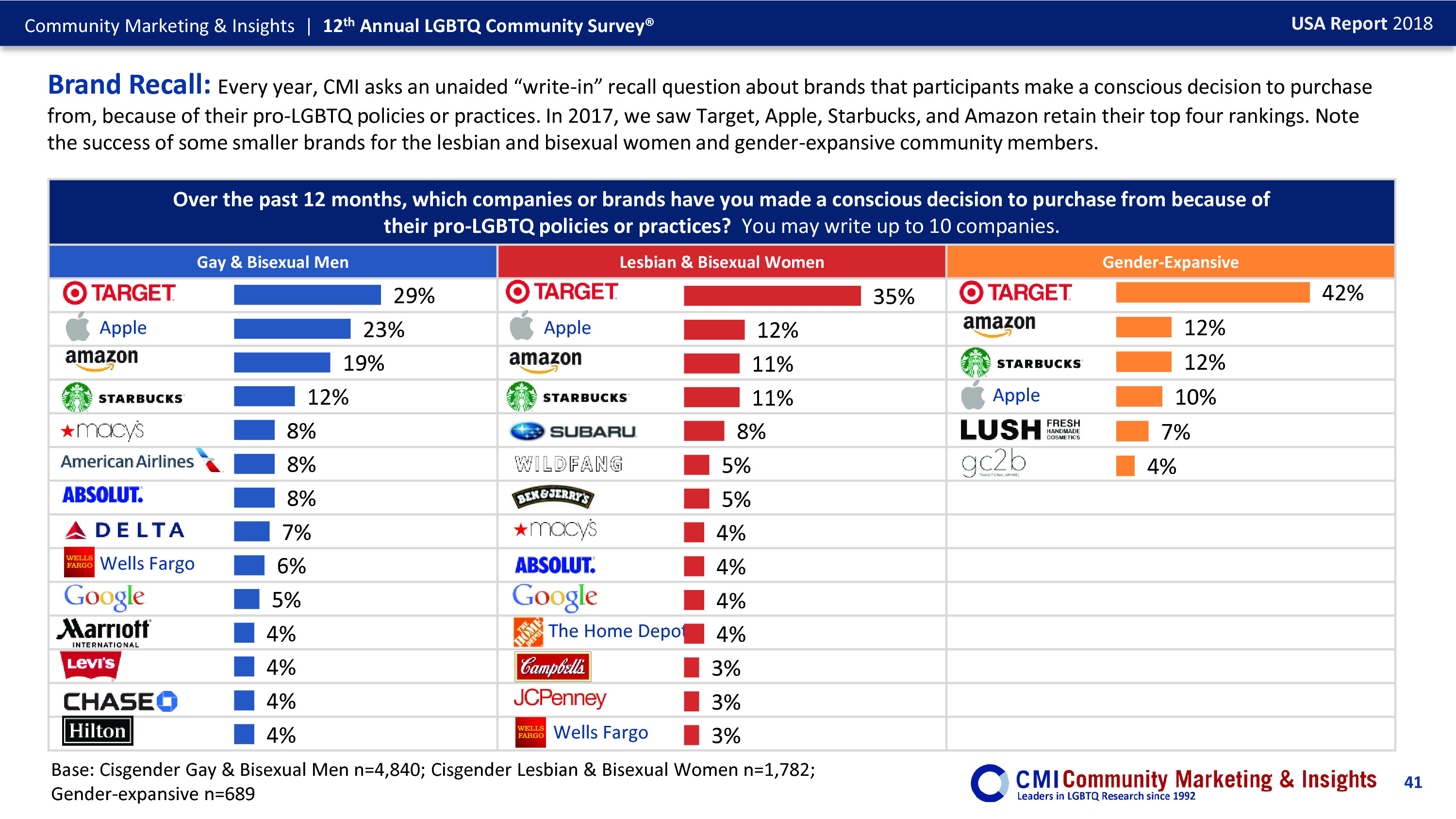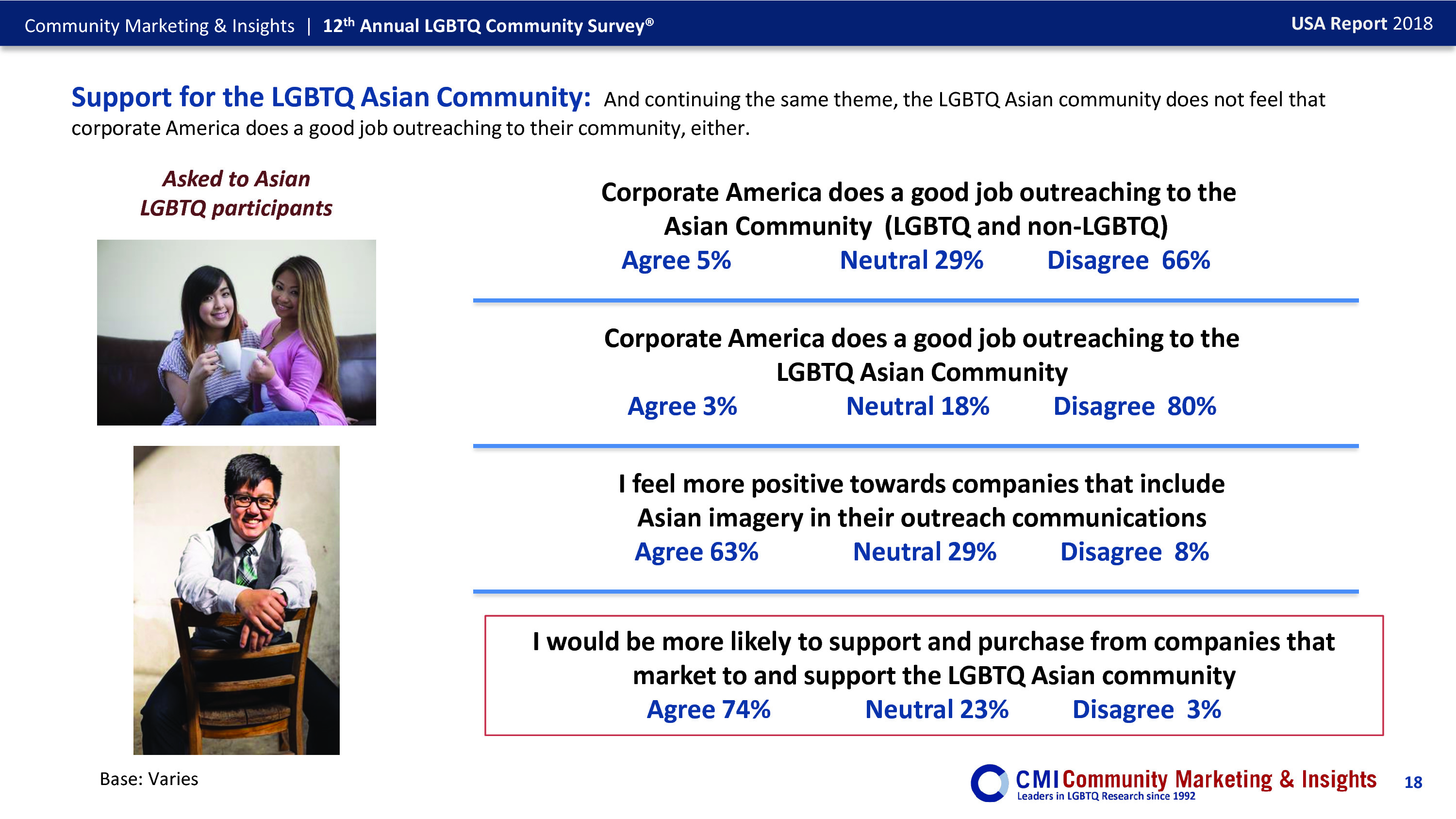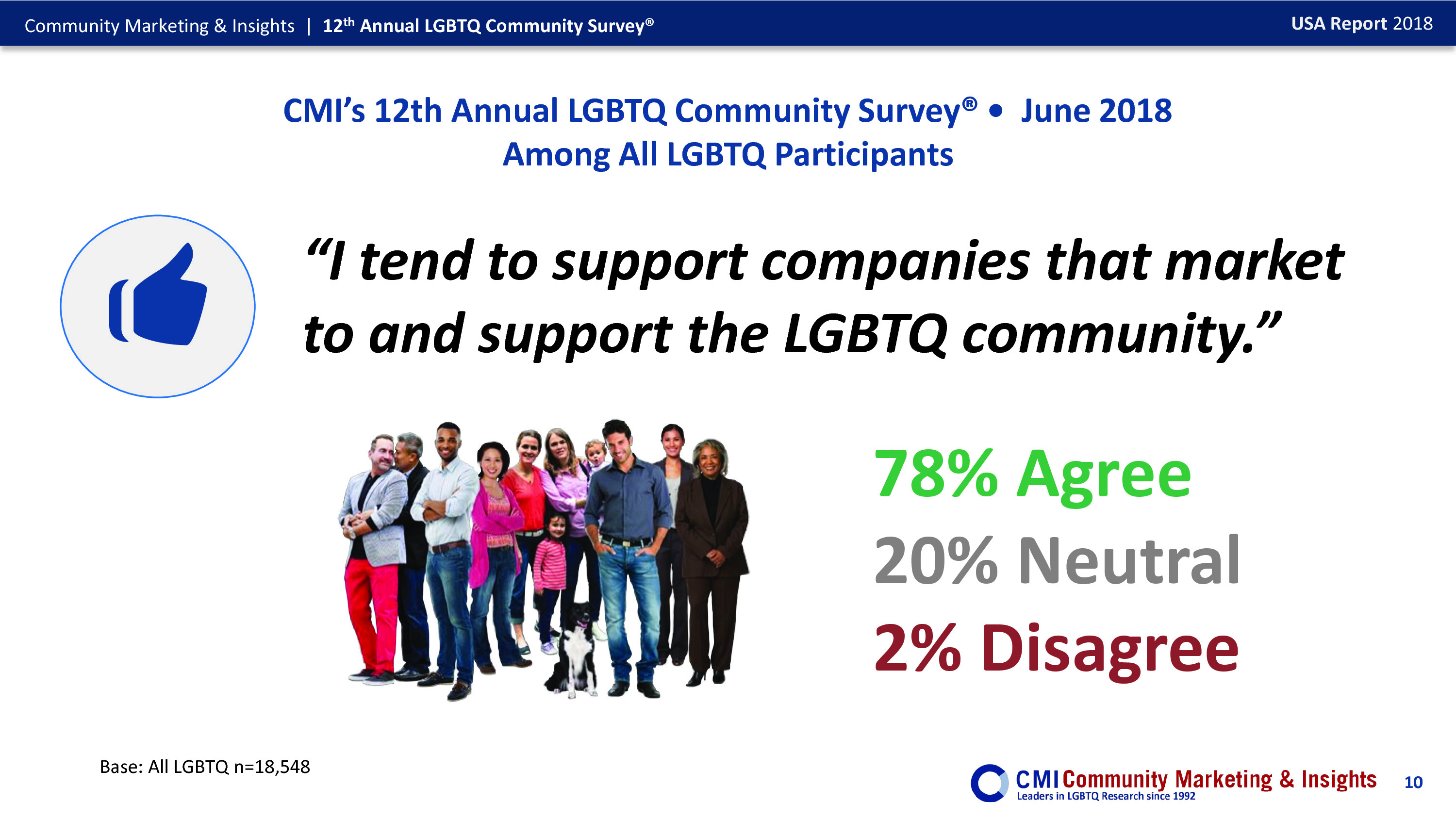 根据CMI的“2018年LGBTQ社区调查报告”,76%的美国受访者认为支持LGBTQ平等的公司将在今年获得更多的业务。85%的美国LGBTQ消费者认为公司支持LGBTQ平等比以往任何时候都更重要,78%的受访者支持那些向LGBTQ社区营销的企业。