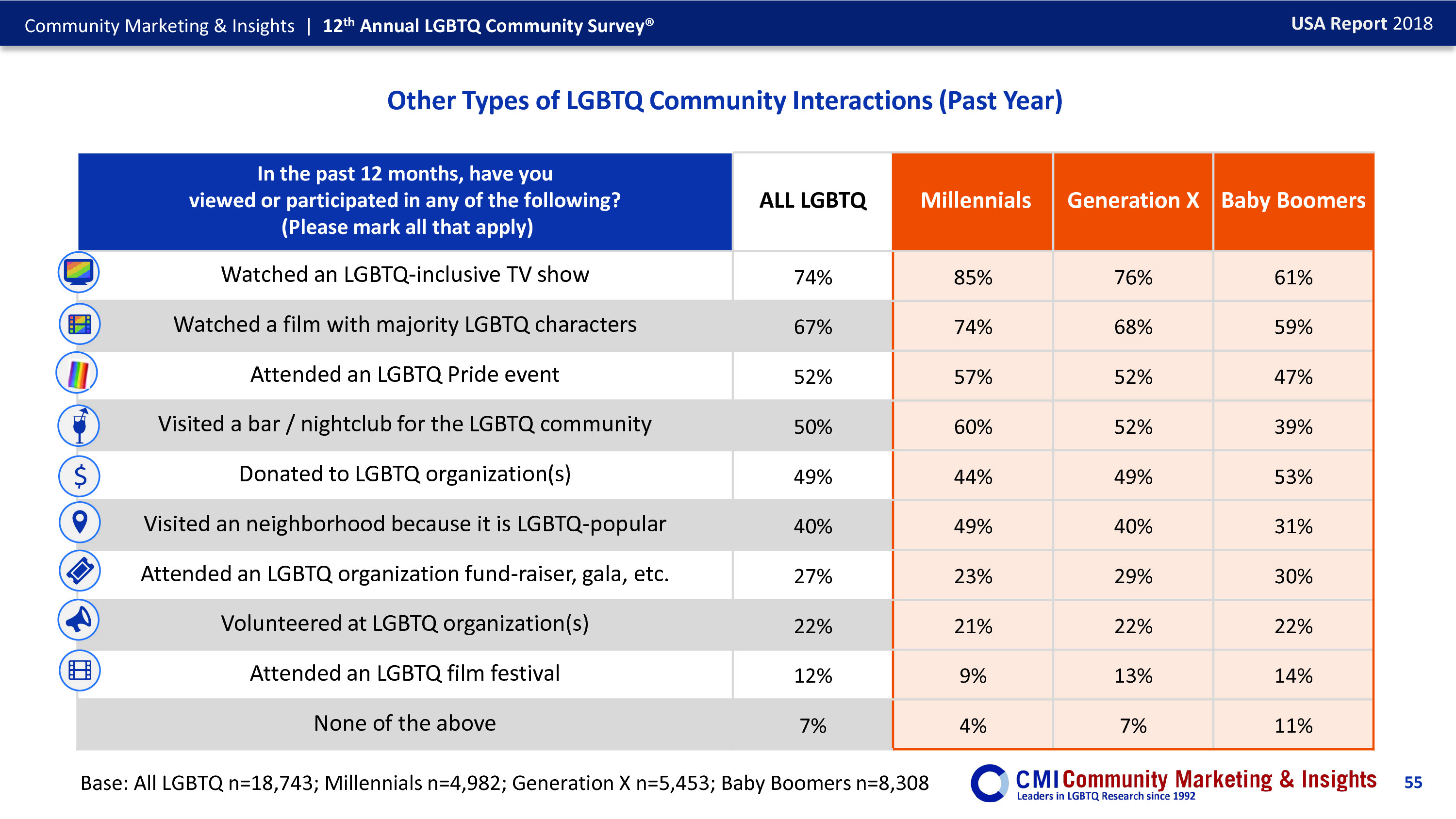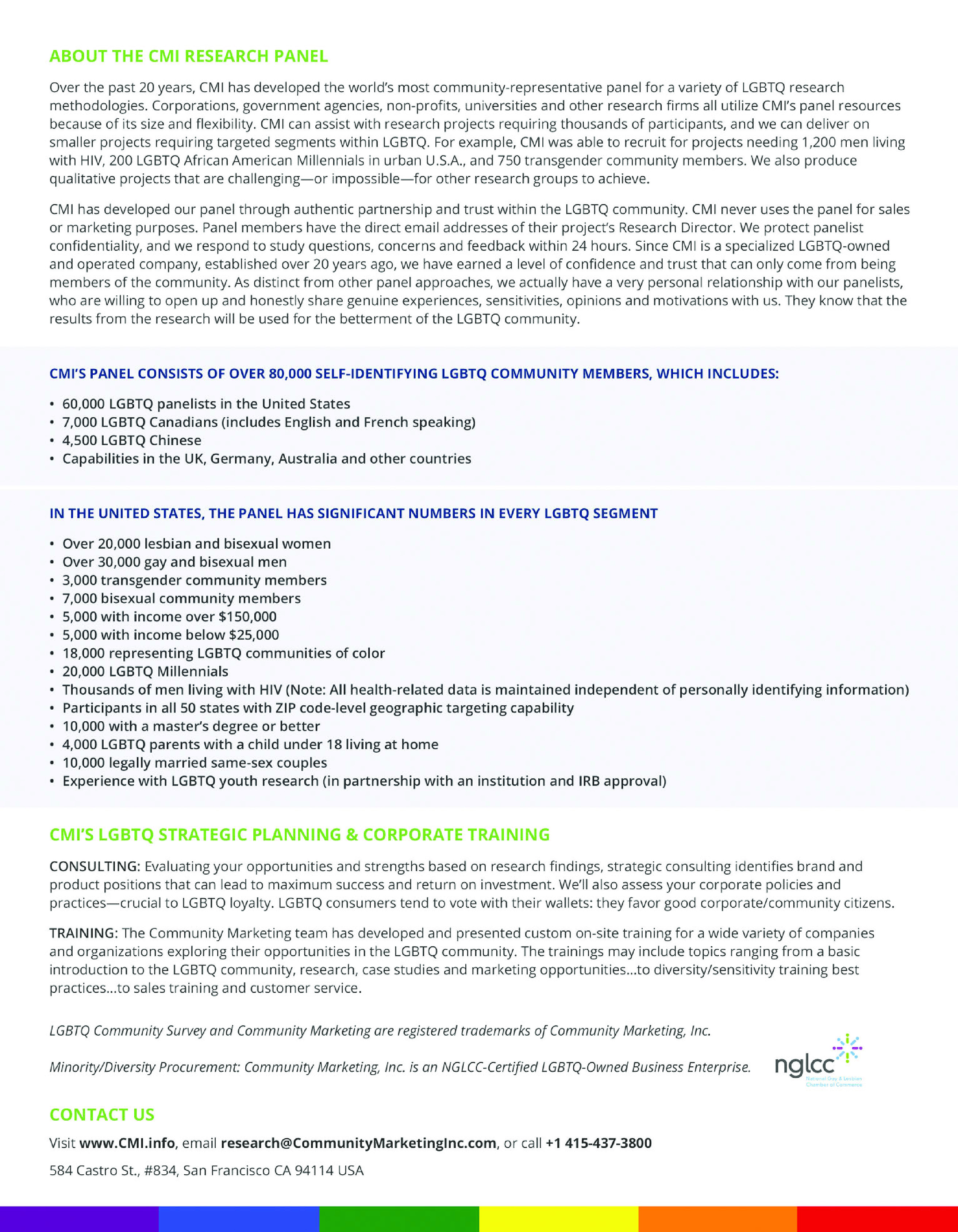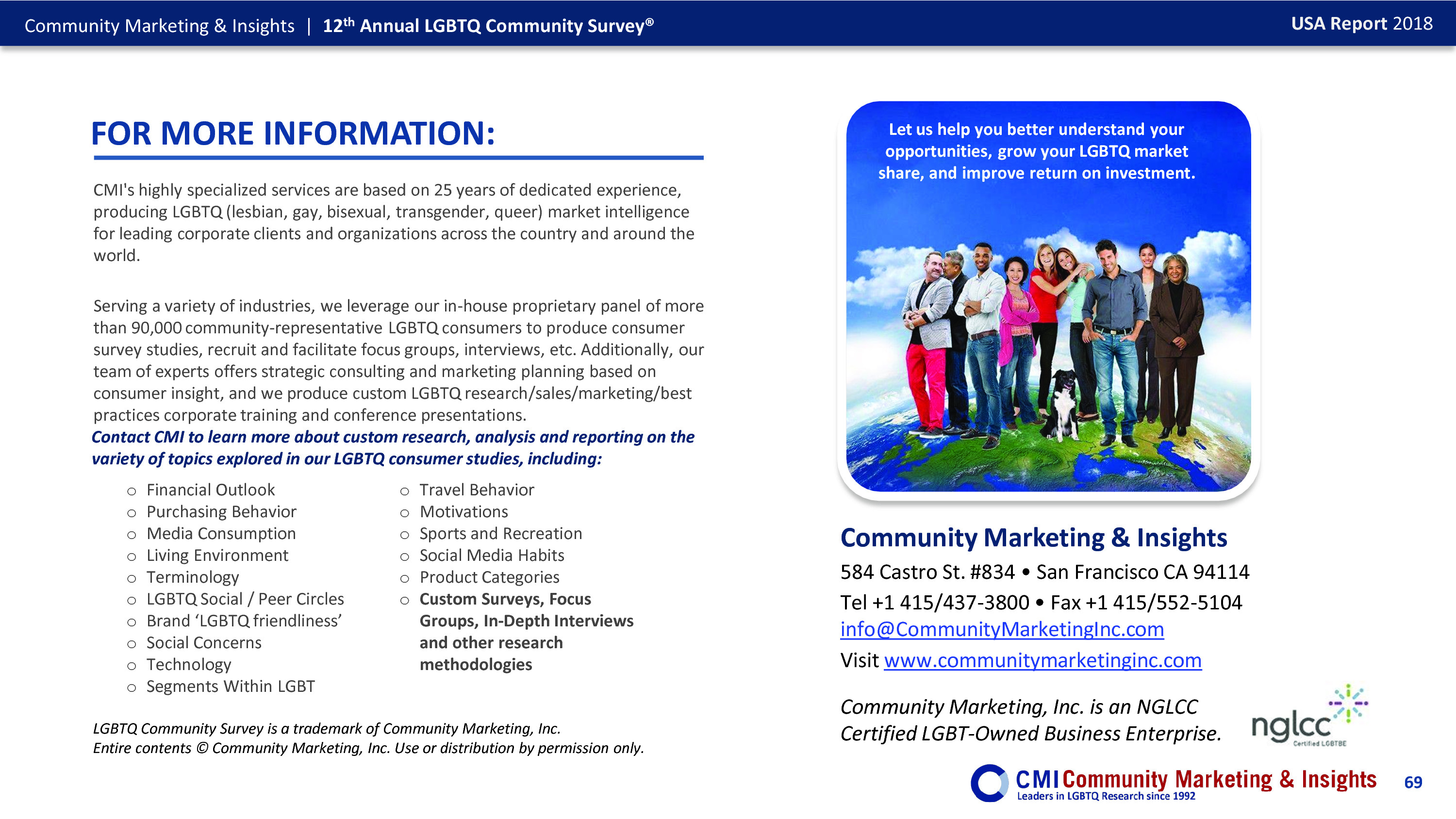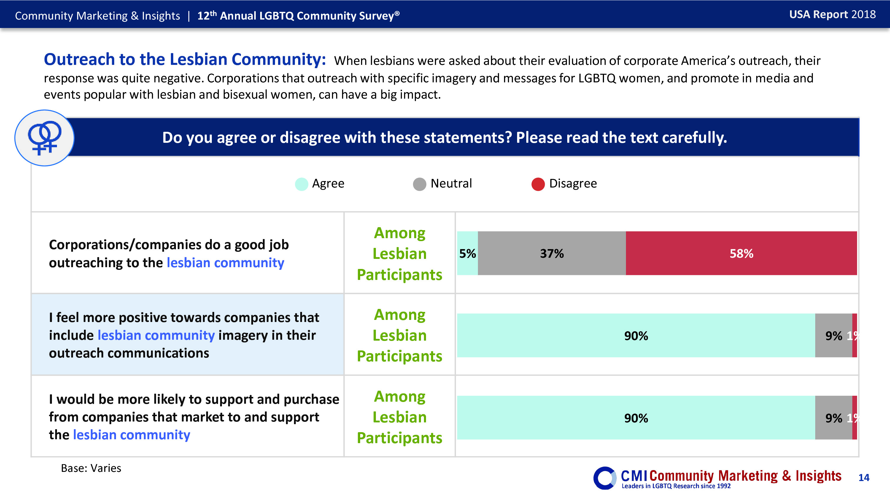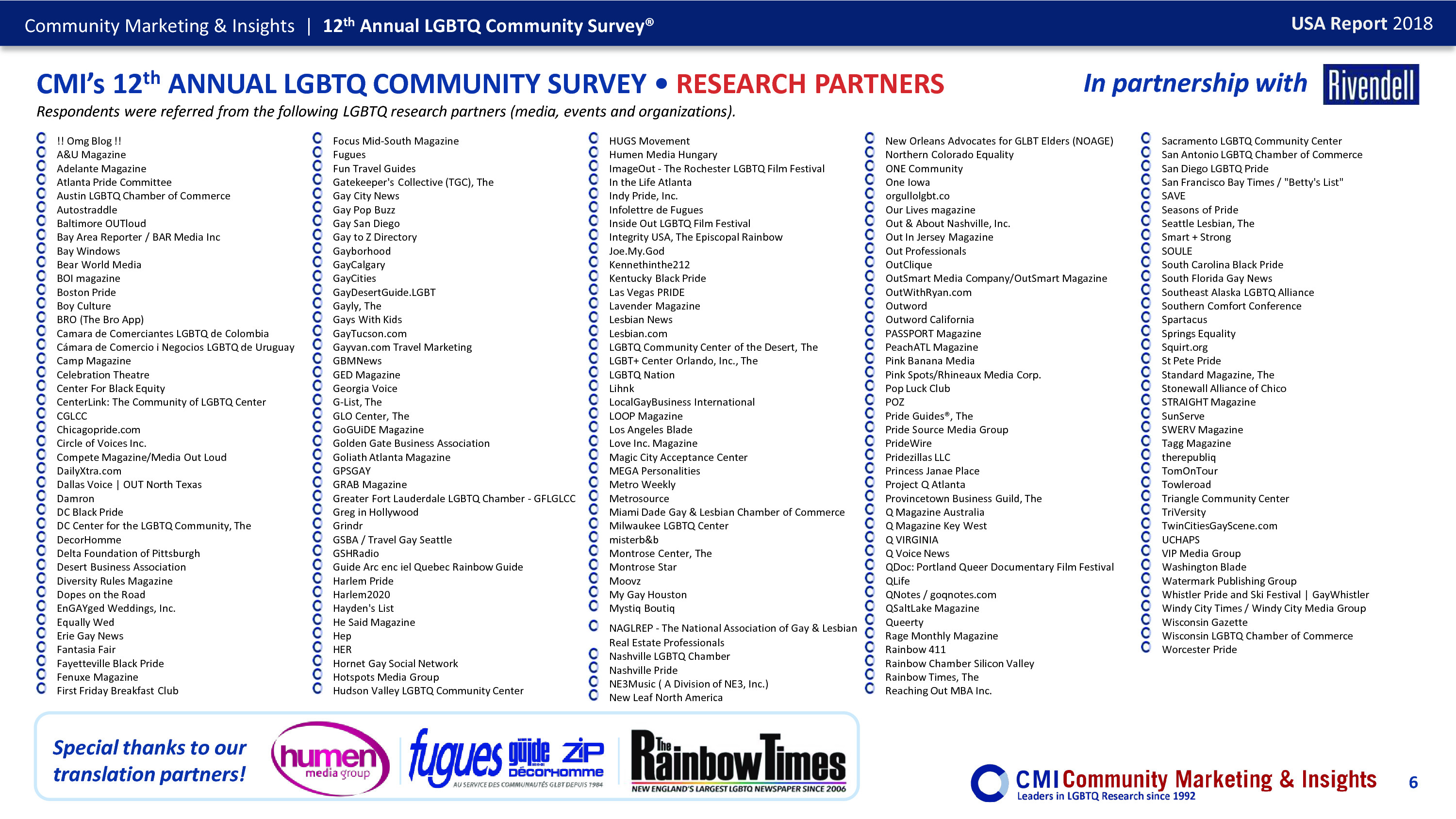 根据CMI的“2018年LGBTQ社区调查报告”,76%的美国受访者认为支持LGBTQ平等的公司将在今年获得更多的业务。85%的美国LGBTQ消费者认为公司支持LGBTQ平等比以往任何时候都更重要,78%的受访者支持那些向LGBTQ社区营销的企业。
