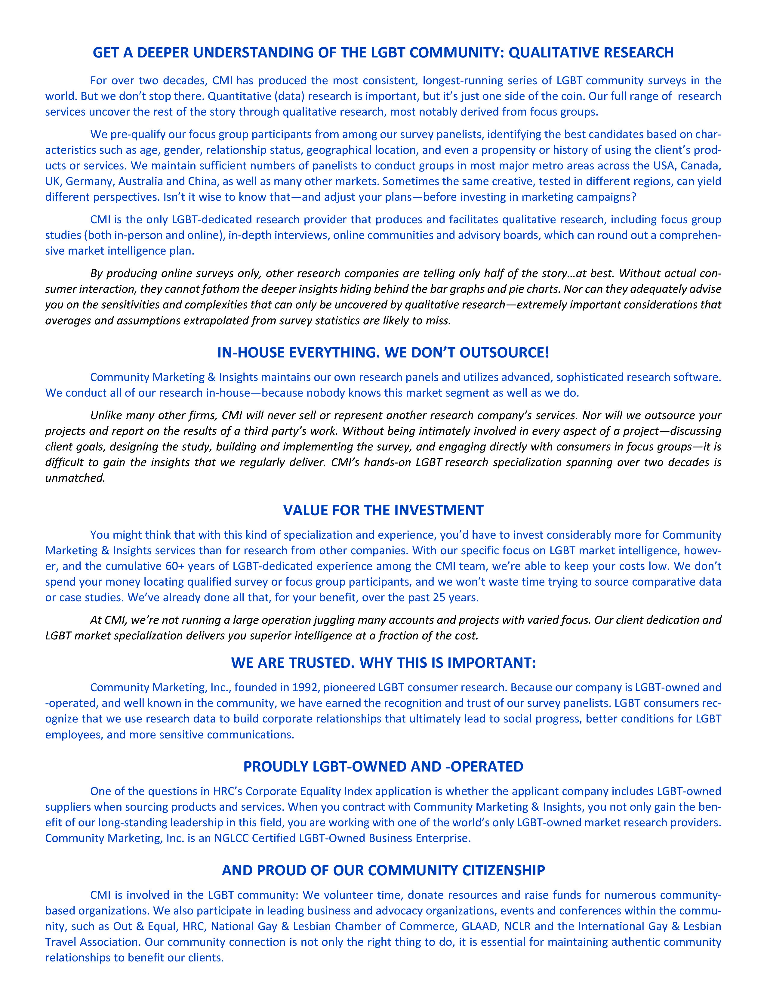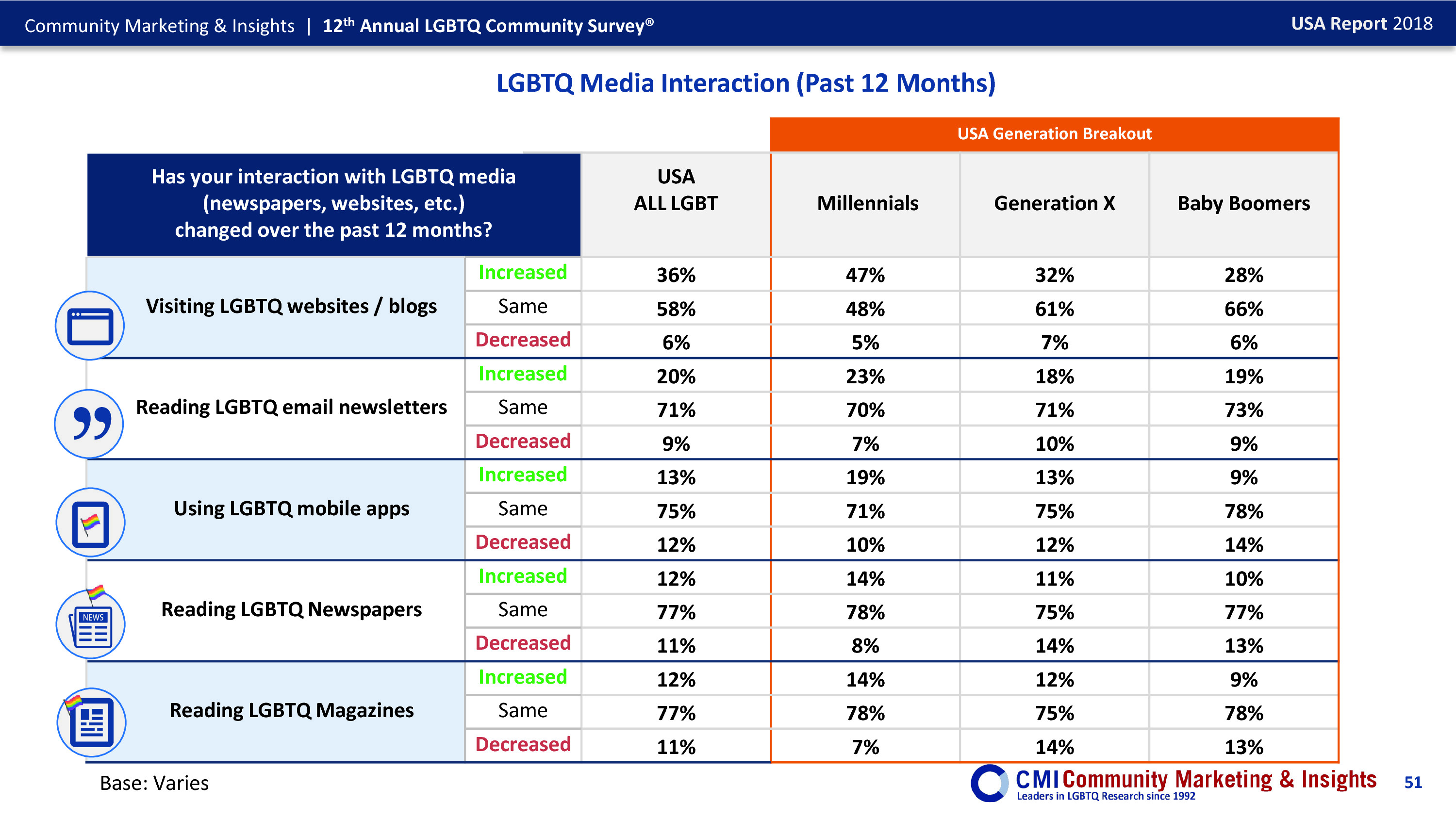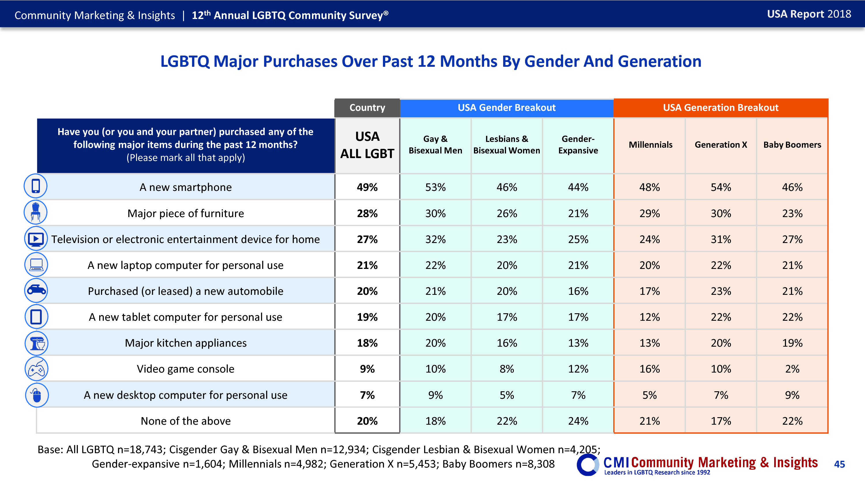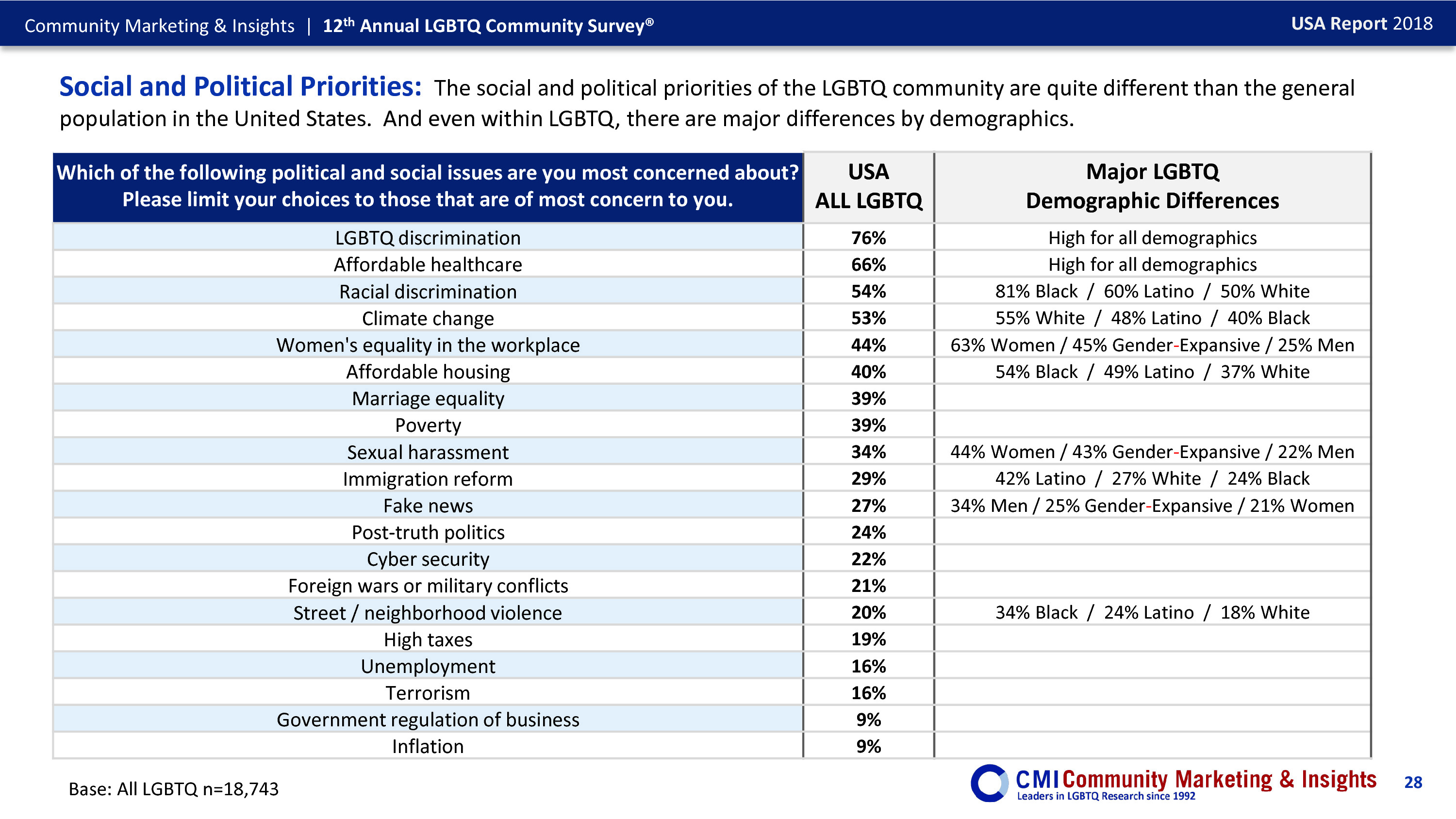 根据CMI的“2018年LGBTQ社区调查报告”,76%的美国受访者认为支持LGBTQ平等的公司将在今年获得更多的业务。85%的美国LGBTQ消费者认为公司支持LGBTQ平等比以往任何时候都更重要,78%的受访者支持那些向LGBTQ社区营销的企业。