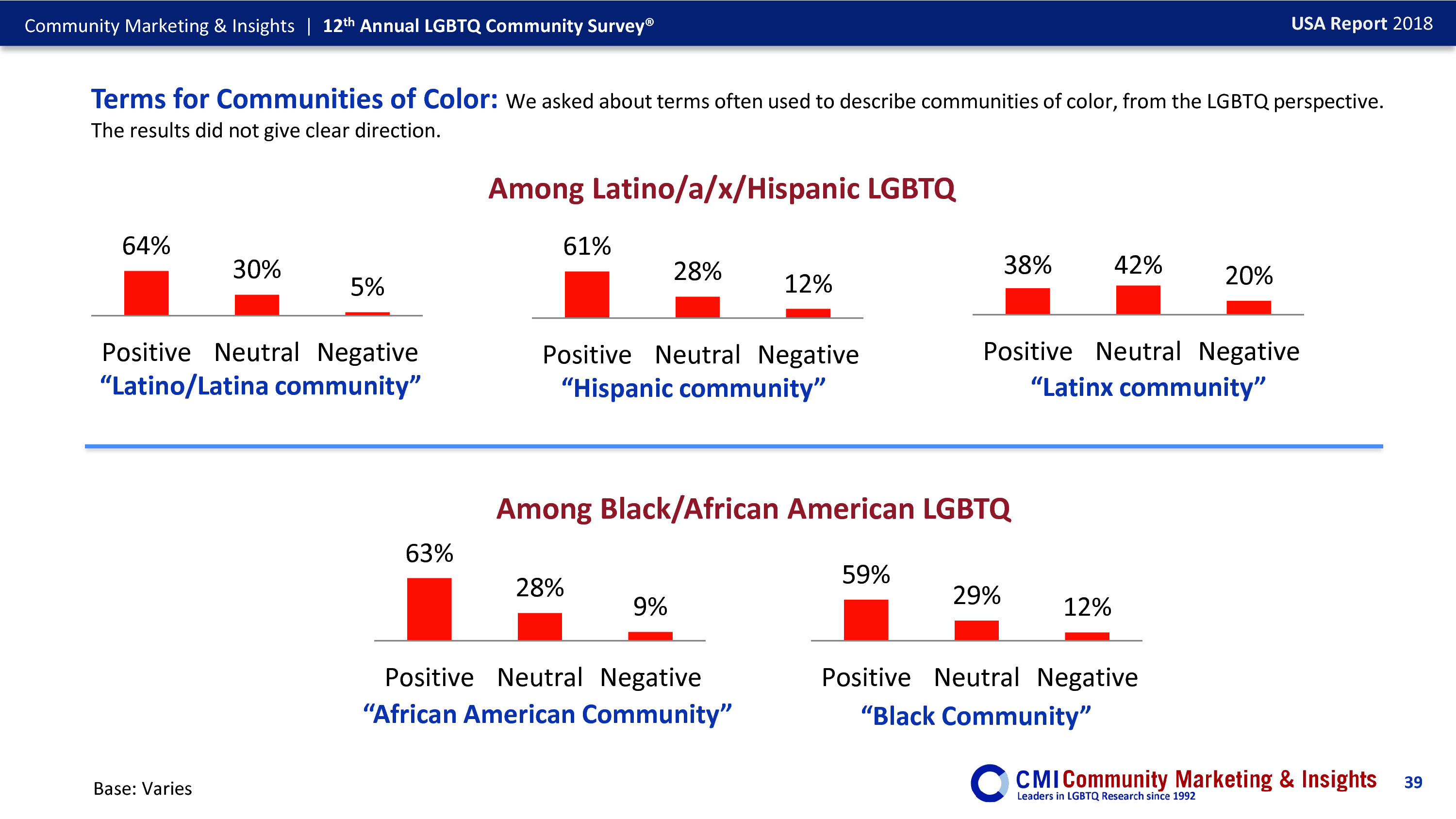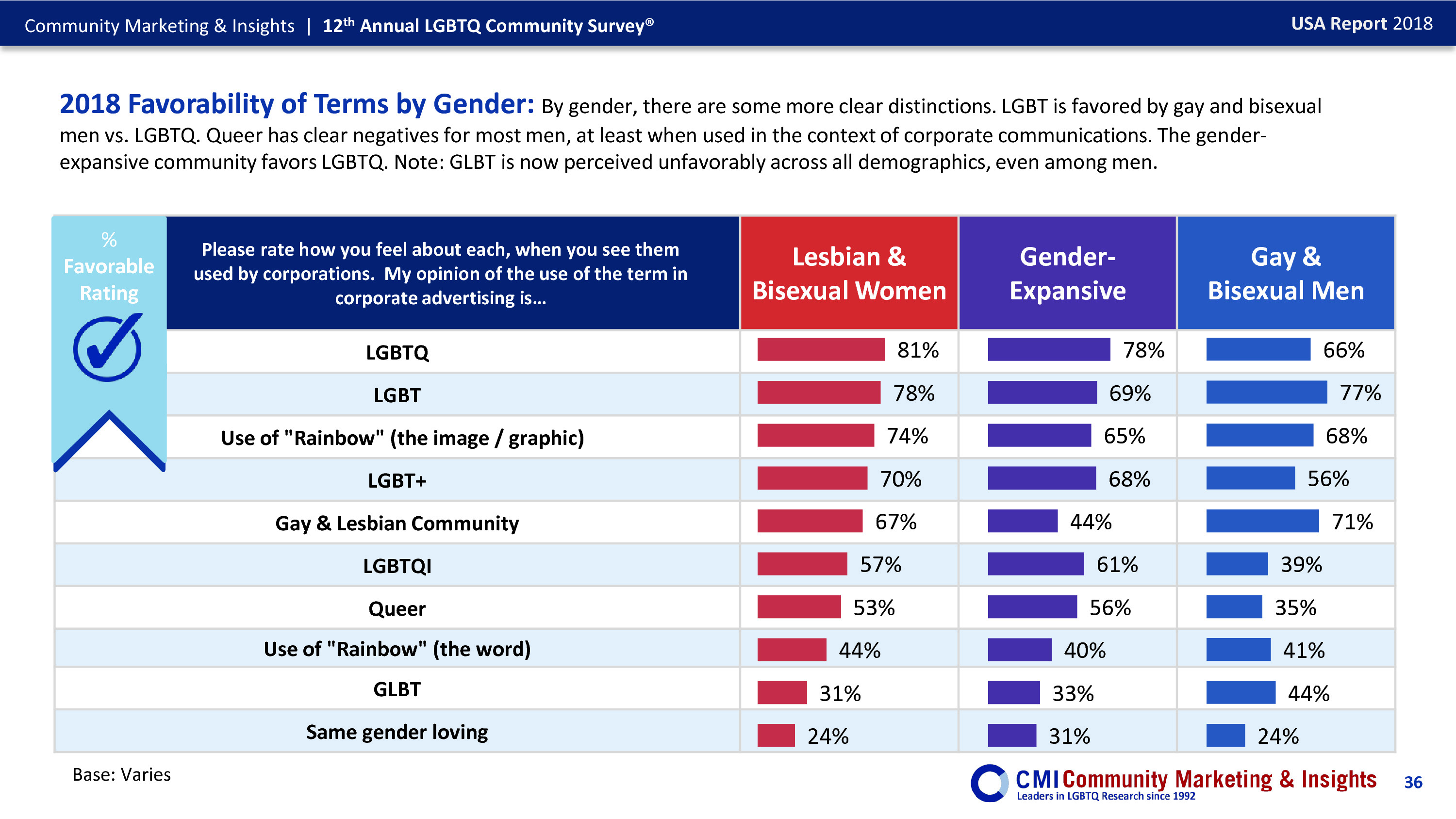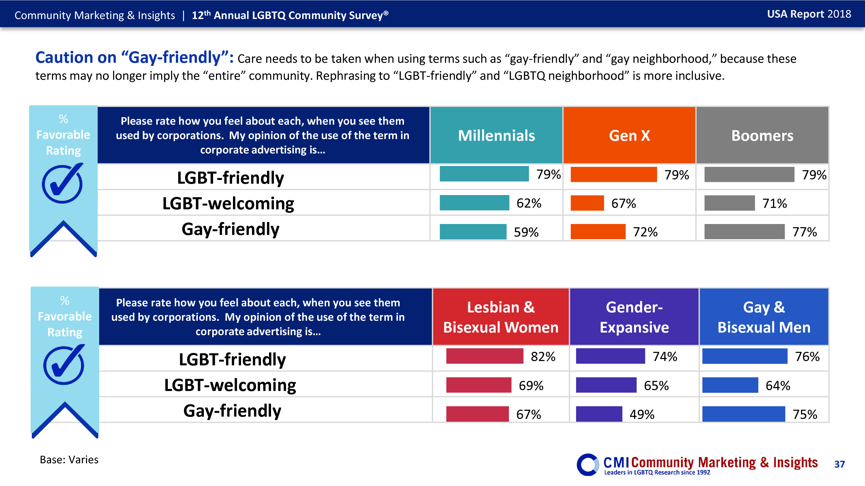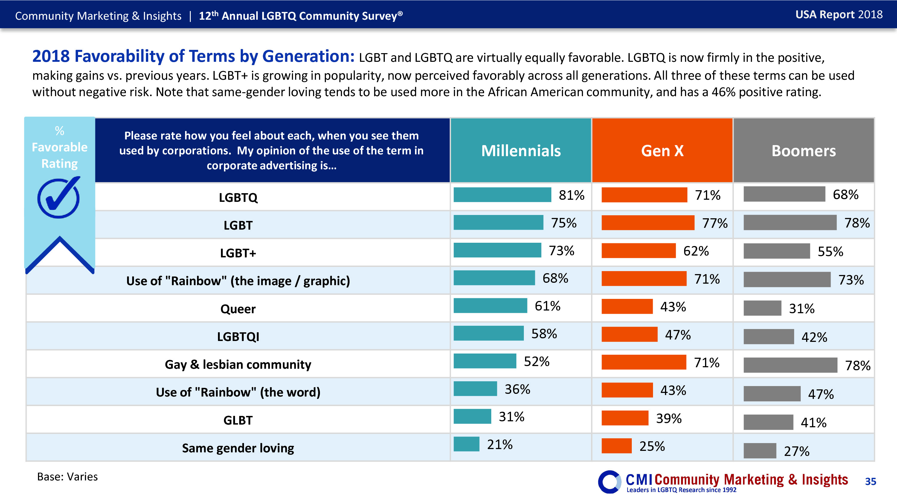 在涉及LGBTQ社区时,公司应该谨慎使用术语,因为有些词并不受欢迎。例如,在千禧一代受访者中,企业广告中使用“LGBTQ”的好感度最高(81%),其次是“LGBT”(75%)和“LGBT +”(73%)。在X世代中,“LGBT”(77%)是最受欢迎的术语;在婴儿潮一代受访者中,“LGBT”(78%)和“同性恋社区”(78%)同样受欢迎。