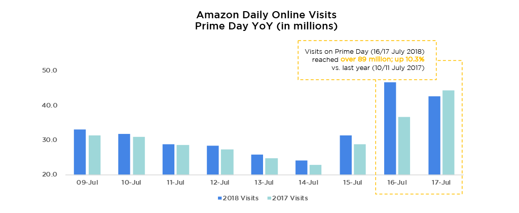 - 亚马逊在Prime Day(7月16-17日)的访问量超过8900万次,比去年增长3%。与2017年的Prime Day相比,增长了1000万次访问。