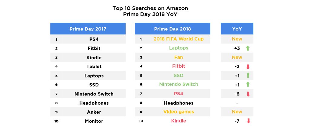 - 2018年FIFA世界杯则是Prime Day期间亚马逊上搜索量最高的关键词,因为足球热潮仍然没有消失。英国天气变热,“风扇”成为搜索量第三高的关键词。