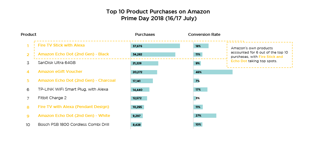 - 亚马逊Fire TV棒和Echo Dot是Prime Day的首选产品,转换率分别为18%和11%,是Prime会员日前一周的两倍。