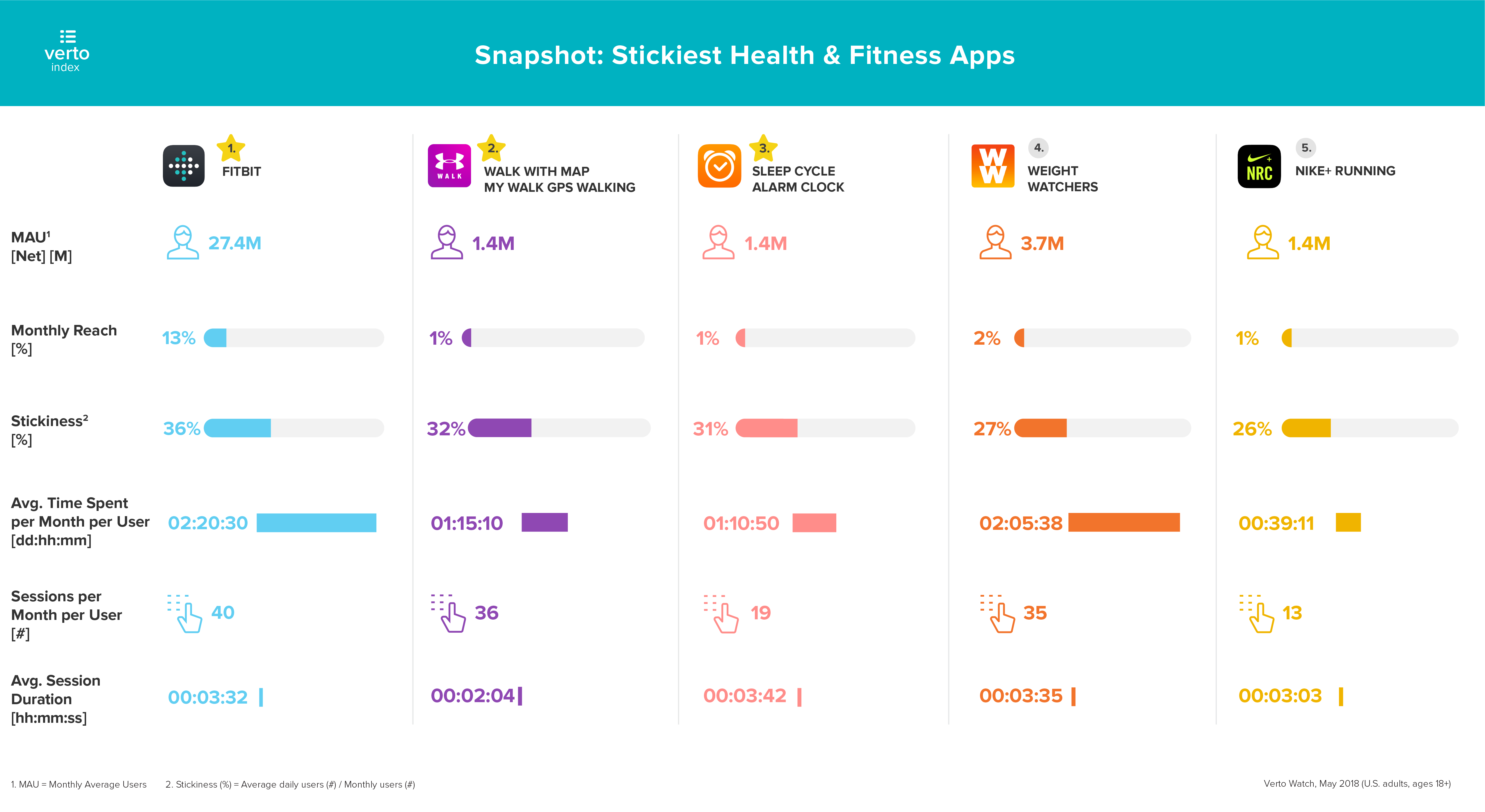Fitbit再一次成为榜首,粘性高达36%,普通用户每月使用Fitbit 40次,或者每天使用一次以上。其次是Map My Walk,粘性为32%。