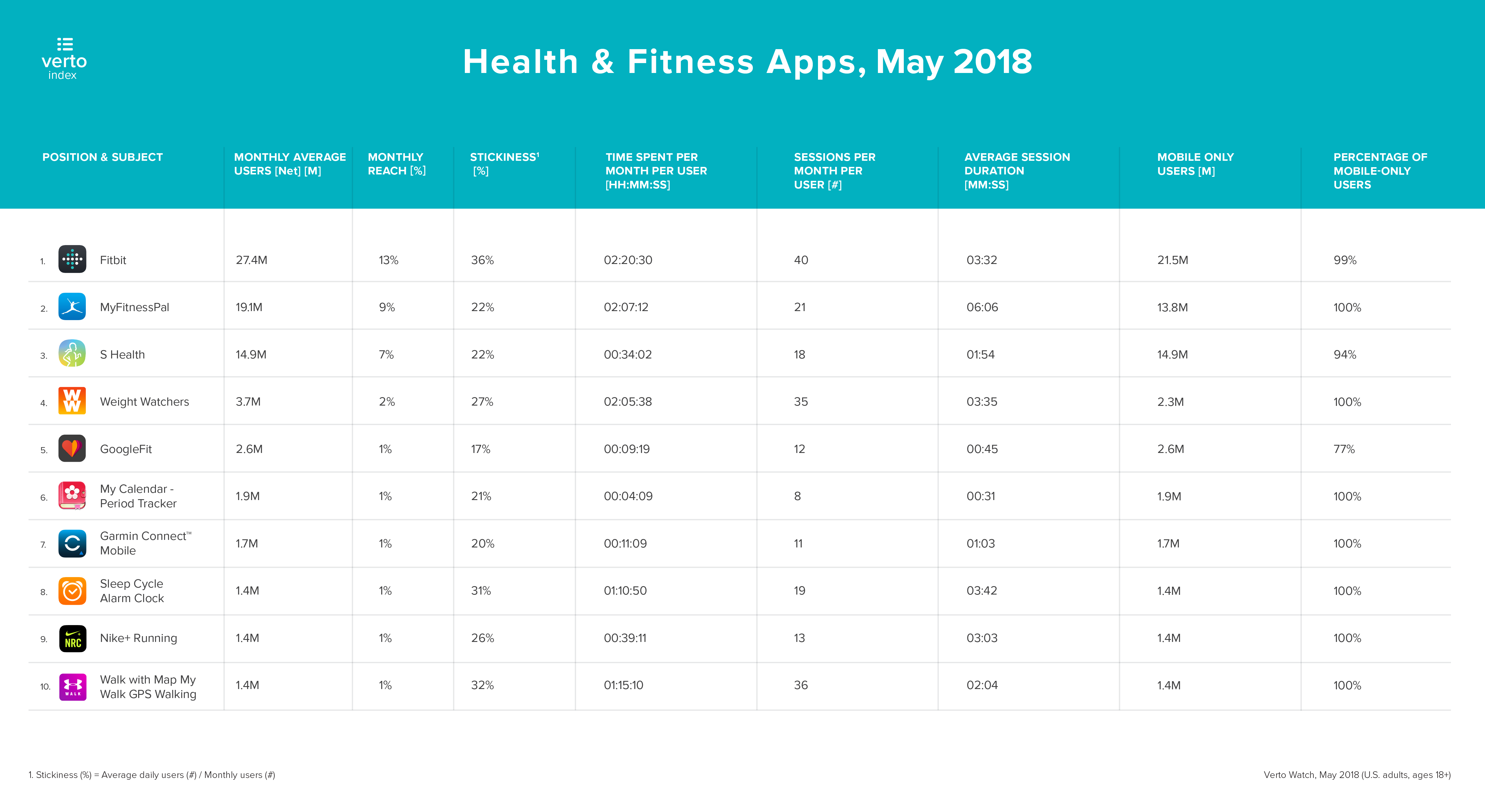 Verto Index发布了美国成年人顶级健康和健身应用排行榜。健身和可穿戴设备市场越来越支持复杂的硬件和软件生态系统。为简单起见,Verto仅调查了提供健康和健身跟踪功能的应用。