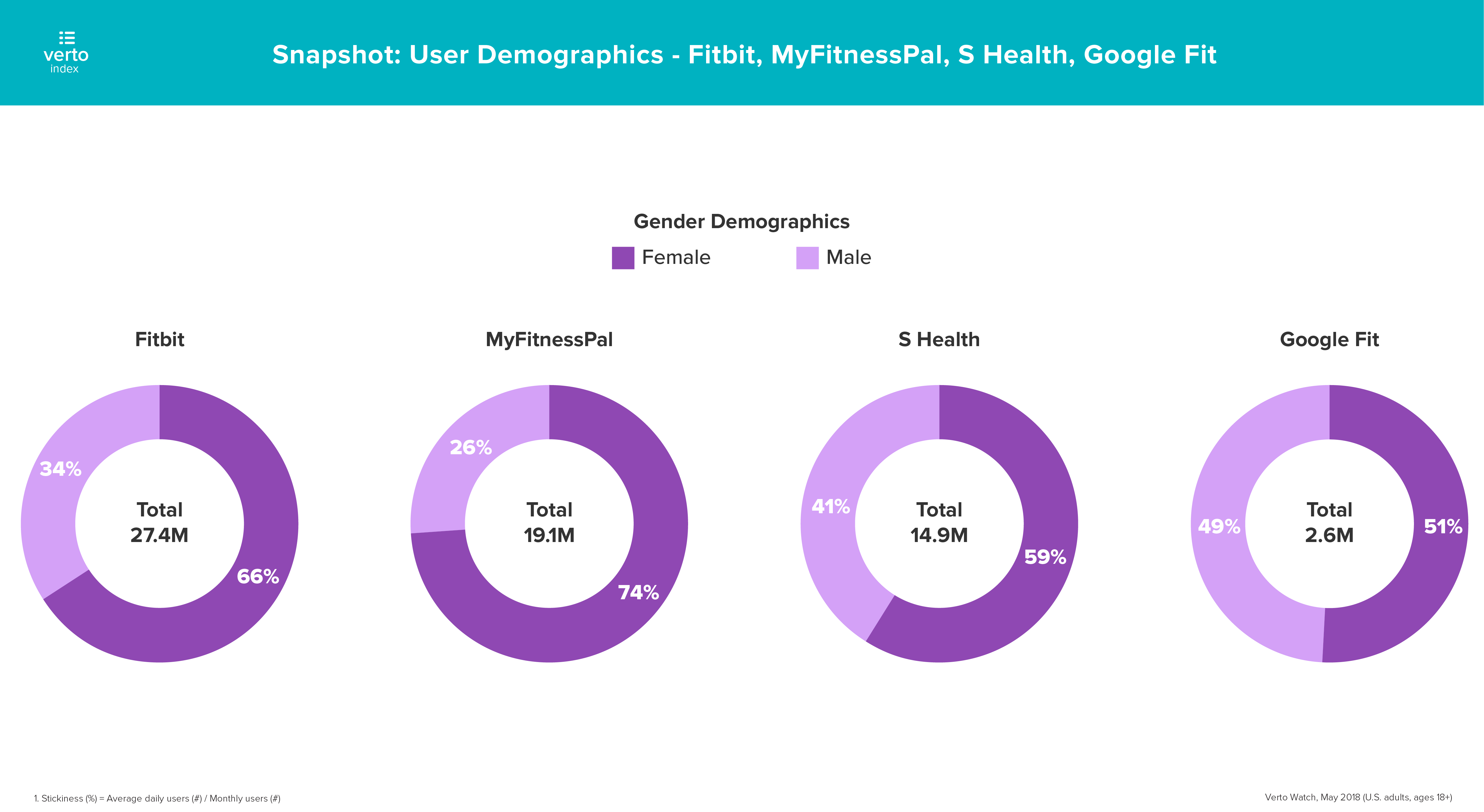 从用户性别来看,顶级健身应用的主要用户群都是女性,例如Fitbit用户中有三分之二是女性,近75%的MyFitnessPal用户是女性。