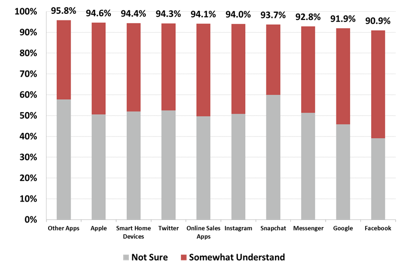 尽管有人担心个人数据可能被滥用,包括财务、医疗、位置数据、购买和交易数据、浏览历史、政治偏好、性取向、电话联系、个人照片或其他个人身份信息,只有5-10%的澳大利亚人认为他们“完全理解”Apple、Twitter、Facebook、Snapchat和Google等公司如何使用和分享他们的个人数据。