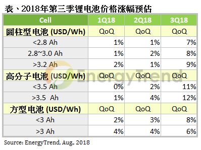 根据集邦咨询新能源研究中心(EnergyTrend)最新调查,受到钴金属价格在2018年第一季创新高影响,第三季锂电池芯预估全面涨价5~15%不等,但价格在第四季有机会持稳。