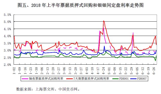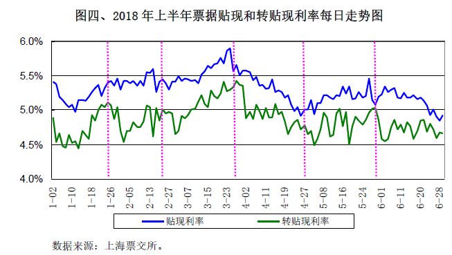 2018年上半年,票据贴现加权平均利率为5.3%[4],同比提高50个基点。转贴现加权平均利率为4.85%,同比提高70个基点。从走势看,一季度利率不断走高,3月末成为上半年利率高点。进入二季度特别是6月中旬以后,票据利率出现下行。