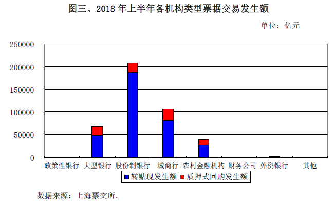 2018年上半年,票据交易发生额为21.28万亿元,同比减少5.15万亿元,下降19.48%。分交易类型看,转贴现17.4万亿元,同比减少5.49万亿元,下降24%;质押式回购3.88万亿元,同比增加3455.93亿元,增长9.79%;买断式回购9.14亿元。分介质看,电票交易20.48万亿元,占比96.25%;纸票交易7970.37亿元,占比3.75%。