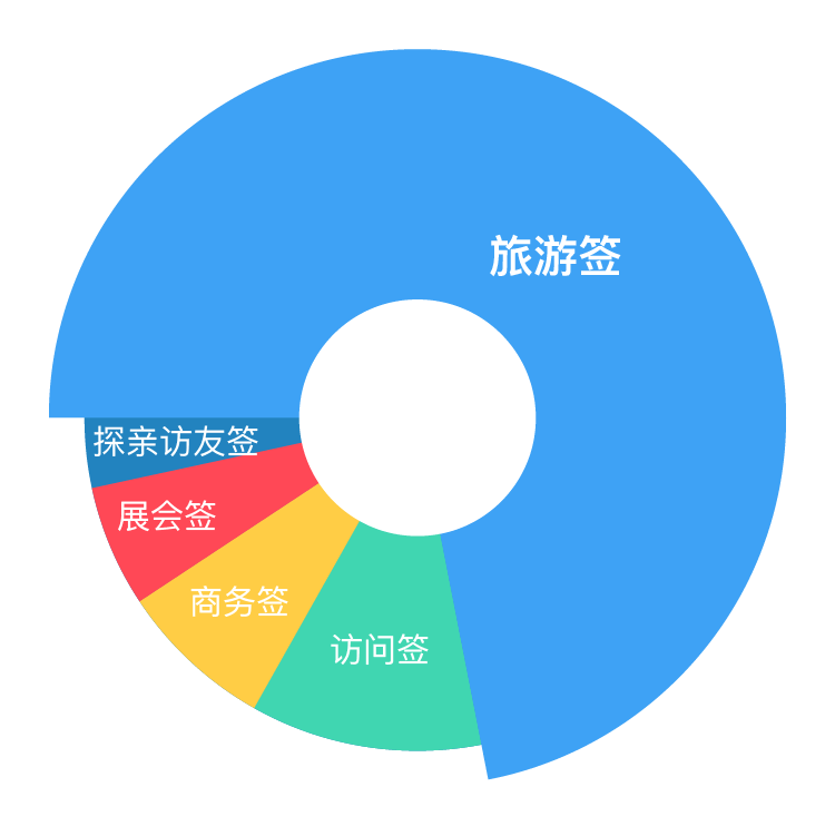 上半年在上上签平台的内地居民出入境证件办理中,旅游签在所有签证类别中占比最高,达到72%,其次分别是访问签、商务签、展会签、探亲访友签。