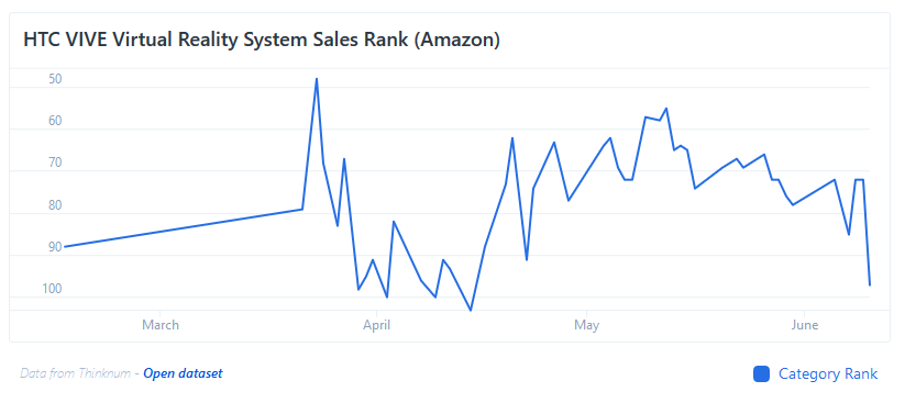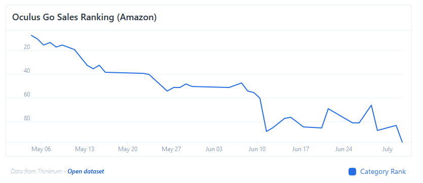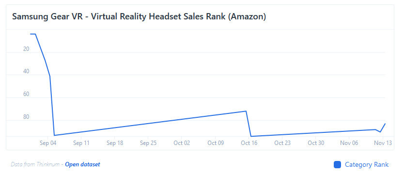 我们研究了索尼(Sony)、三星(Samsung)、Facebook/Oculus和HTC的四款主要VR头显的销售趋势。这四种设备在亚马逊的销量排名都在下降。