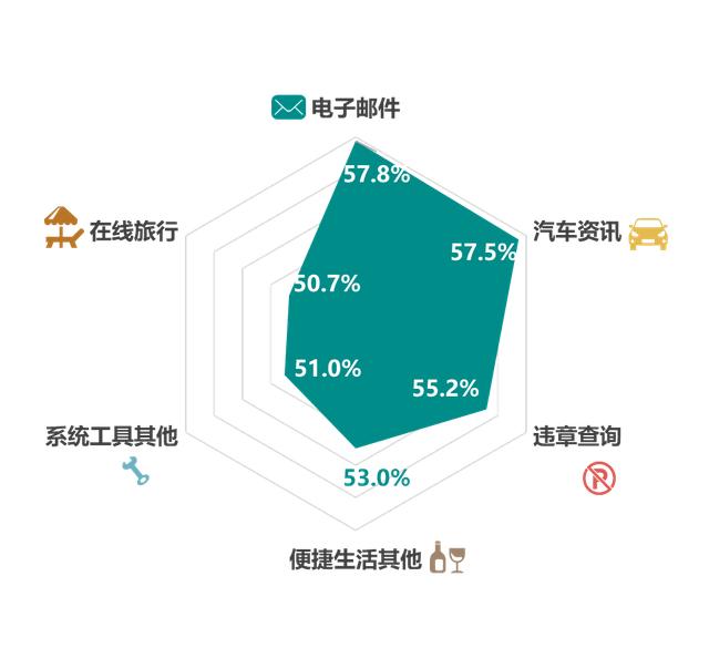 奥迪车主电子邮件类媒介安装使用最频繁,可见日常工作占据大头,与此同时汽车资讯类、在线旅游出行类媒介占比也较高,可见这是一群既注重工作也看重享受生活的群体。