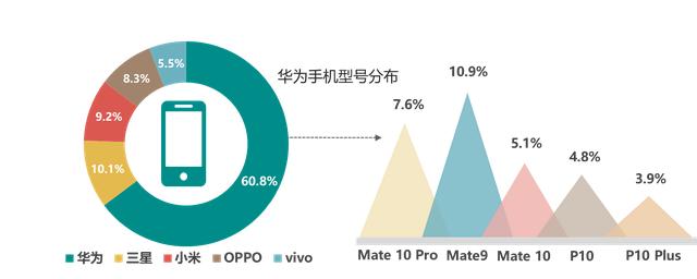 其中Mate系列最受偏爱,Mate9占比达到10.9%,Mate 10 pro占比达到7.6%,均属于中高端机型。