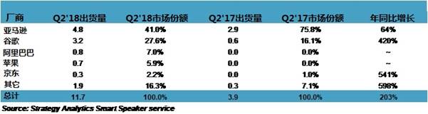Strategy Analytics的最新智能音箱研究报告《2018年Q2智能音箱厂商&操作系统出货量和安装量市场份额按区域划分》指出,亚马逊全球智能音箱出货量份额从2018年Q1的44%和2017年Q2的76%下降至2018年Q2的41%。相比之下,谷歌在2018年Q2的份额增加到28%, 而去年同期仅为16%。 阿里巴巴排名第三,紧随其后的是苹果和京东。该报告提供了全球前20名智能音箱厂商排名和全球领先的14种语音操作系统的详细季度指标。