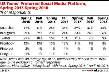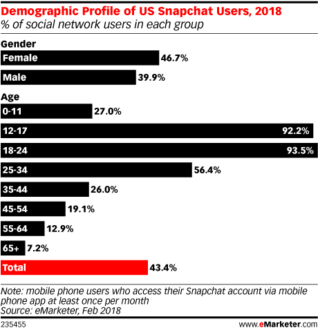 Snapchat用户增长不可忽略的一个特点是它对年轻用户的吸引力。Snap在青少年和年轻社交网民中的普及率高达95%。这些年轻用户青睐Snapchat,尽管2017年11月的新设计受到吐槽。
