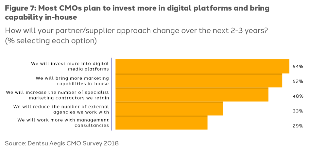 52%的受访者表示将在内部实现更多的营销能力,33%的营销高管将减少合作的外部机构的数量。