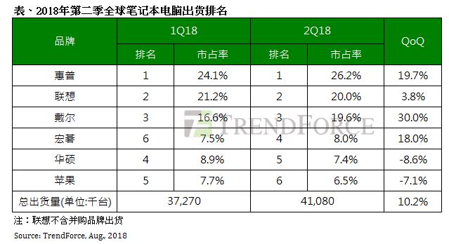全球市场研究机构集邦咨询最新笔记本电脑出货报告显示,2018年第二季全球笔记本电脑出货为4,108万台,较第一季大增10.2%,年增率达2.8%,优于预期。展望第三季,受到商务标案需求热度延续以及即将到来的销售旺季备货拉动下,预估季增长约5~6%。