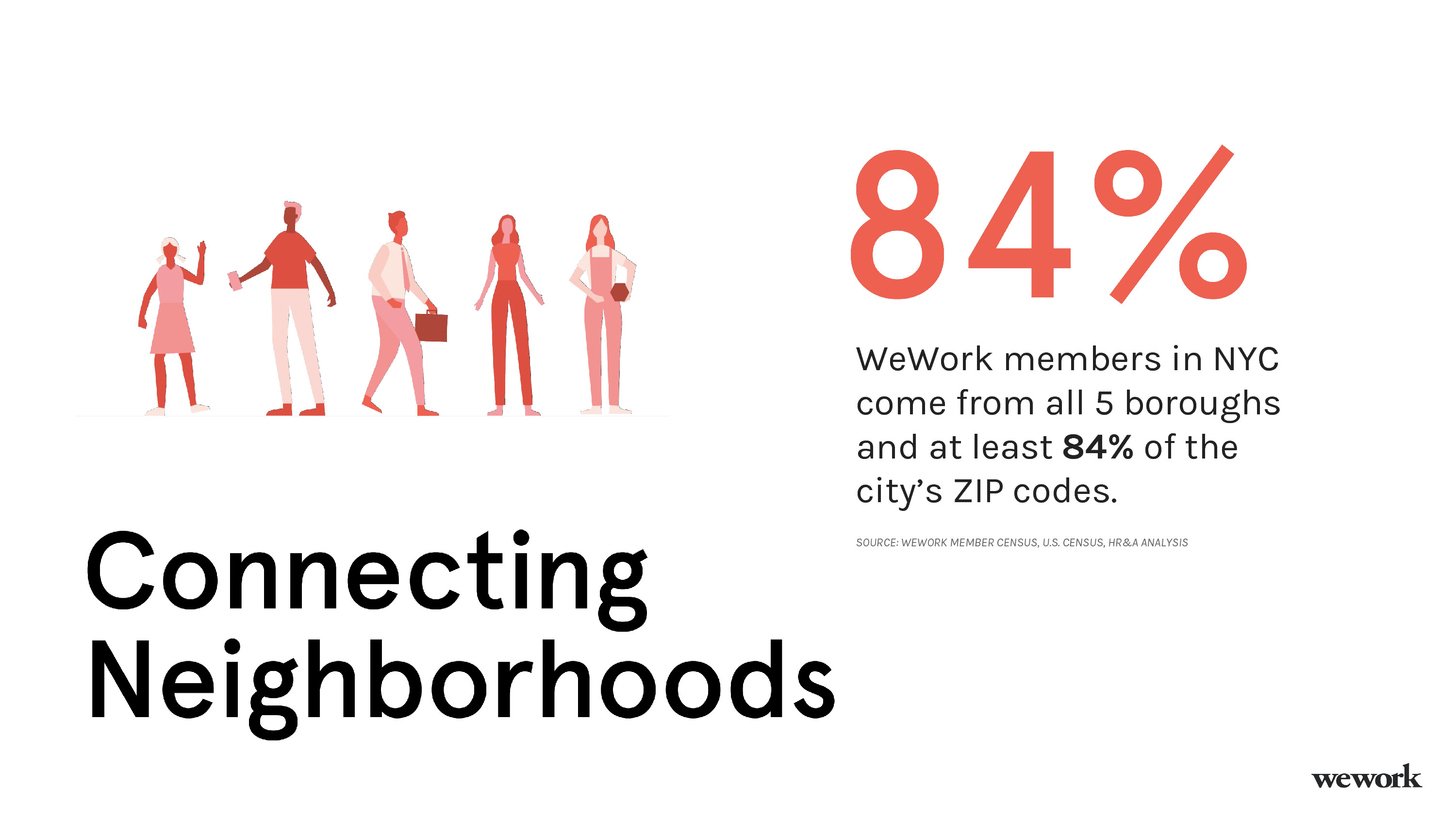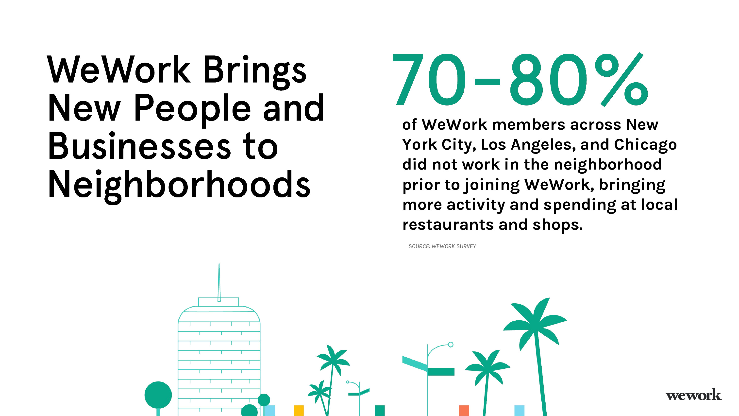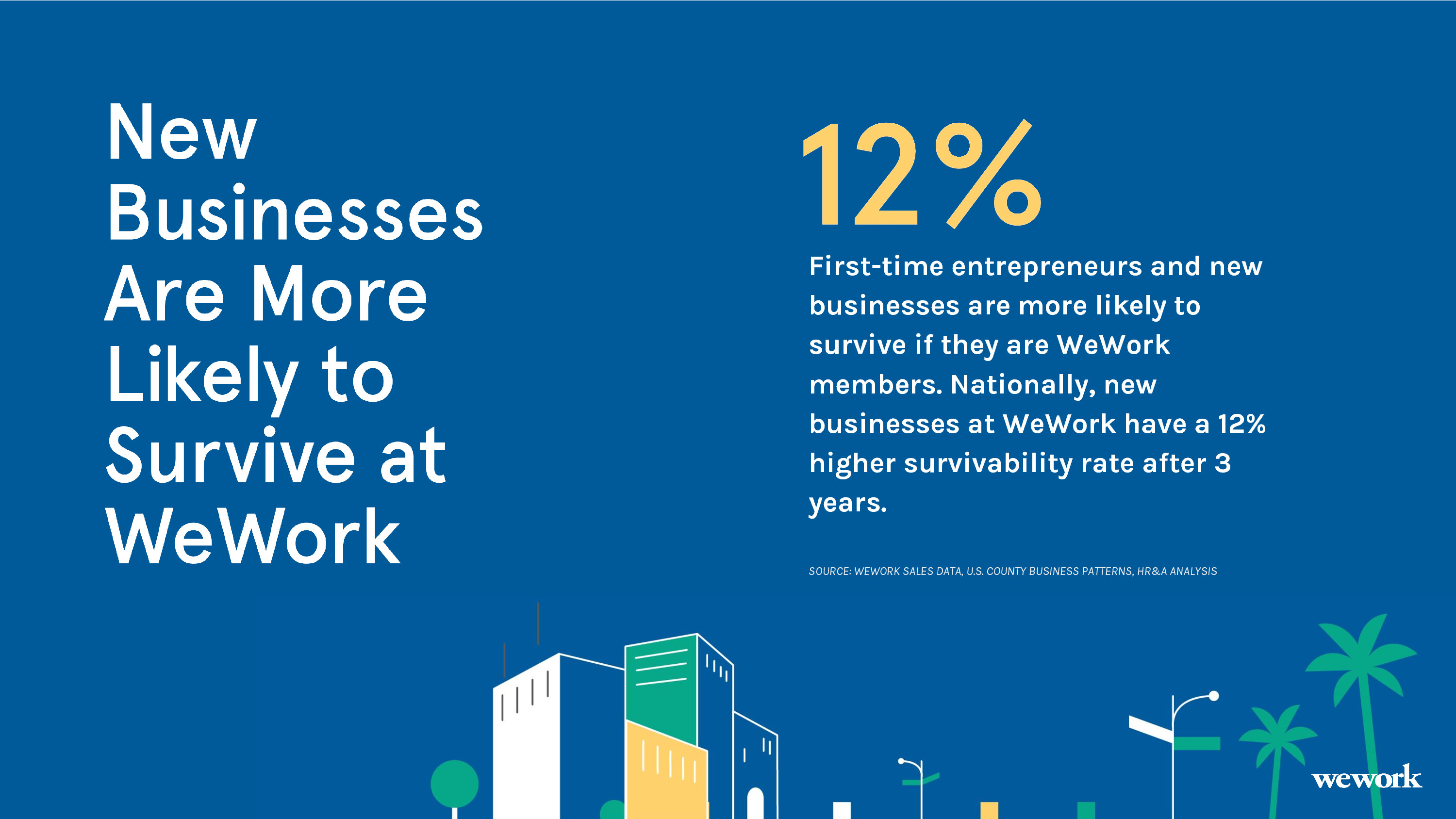 大约75%的WeWork成员是小型企业,包括首次创业者、本地公司和非营利组织,以及不断发展的创业公司。和在家、在咖啡馆或传统办公室相比,WeWork成员企业更具有竞争优势。三年后,成员企业比同行生存率高12%。