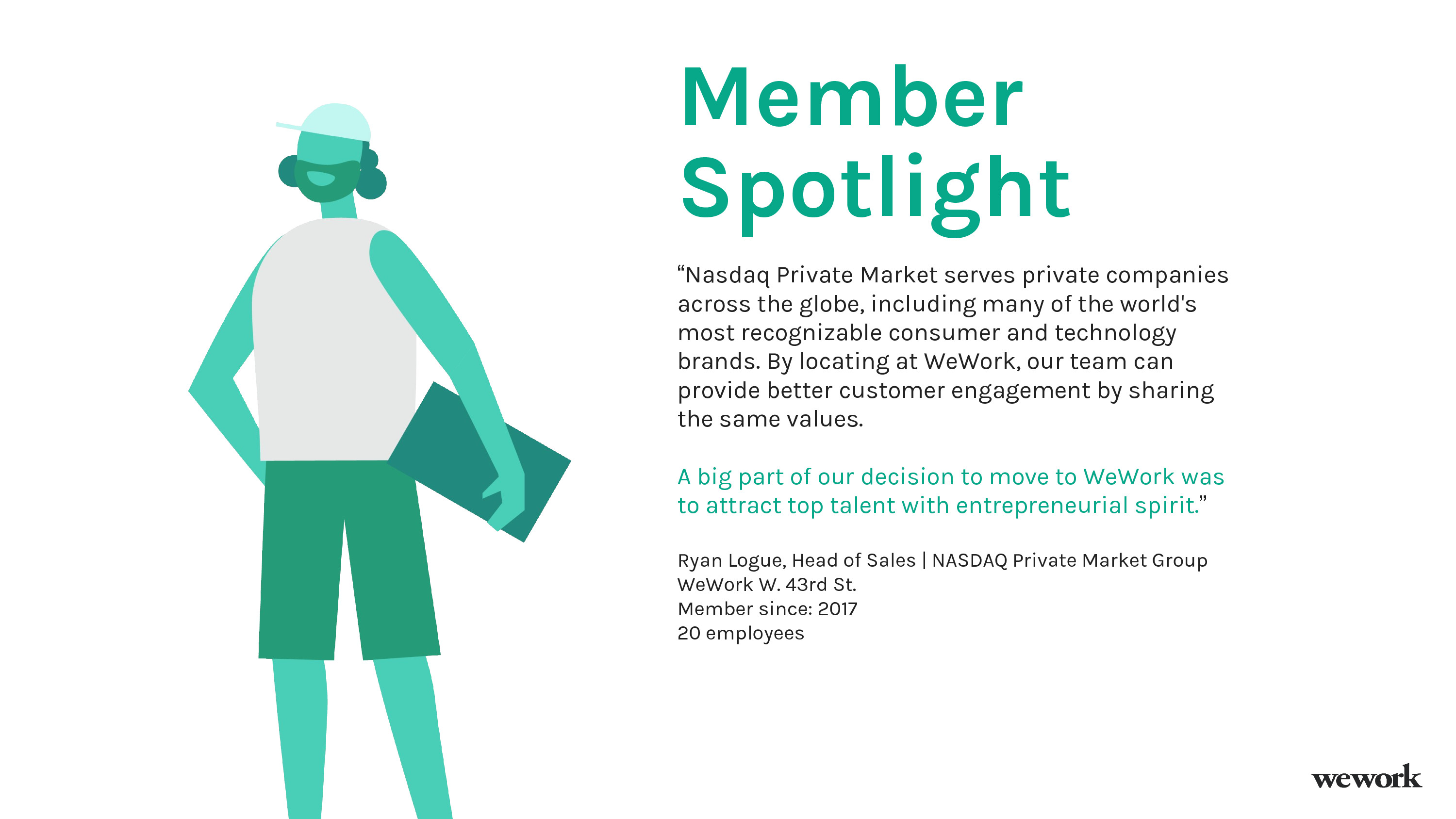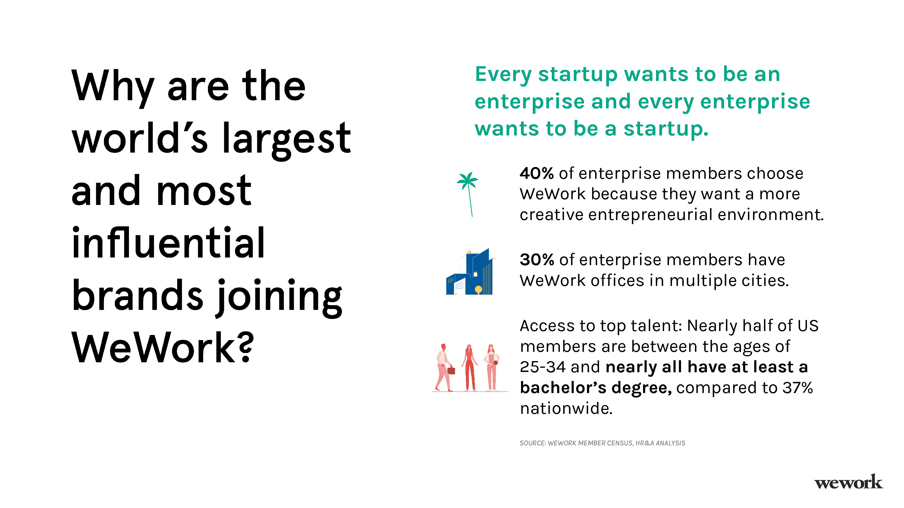 事实上,财富500强中有22%是WeWork会员。世界上最大、最有影响力的品牌为什么加入WeWork?这是为了确保获得各种顶尖人才,WeWork的美国成员中约有一半是24-34岁的千禧一代,超过40%是35岁以上的经验丰富的专业人士,几乎所有人都至少拥有学士学位,全国的比例只有37%。