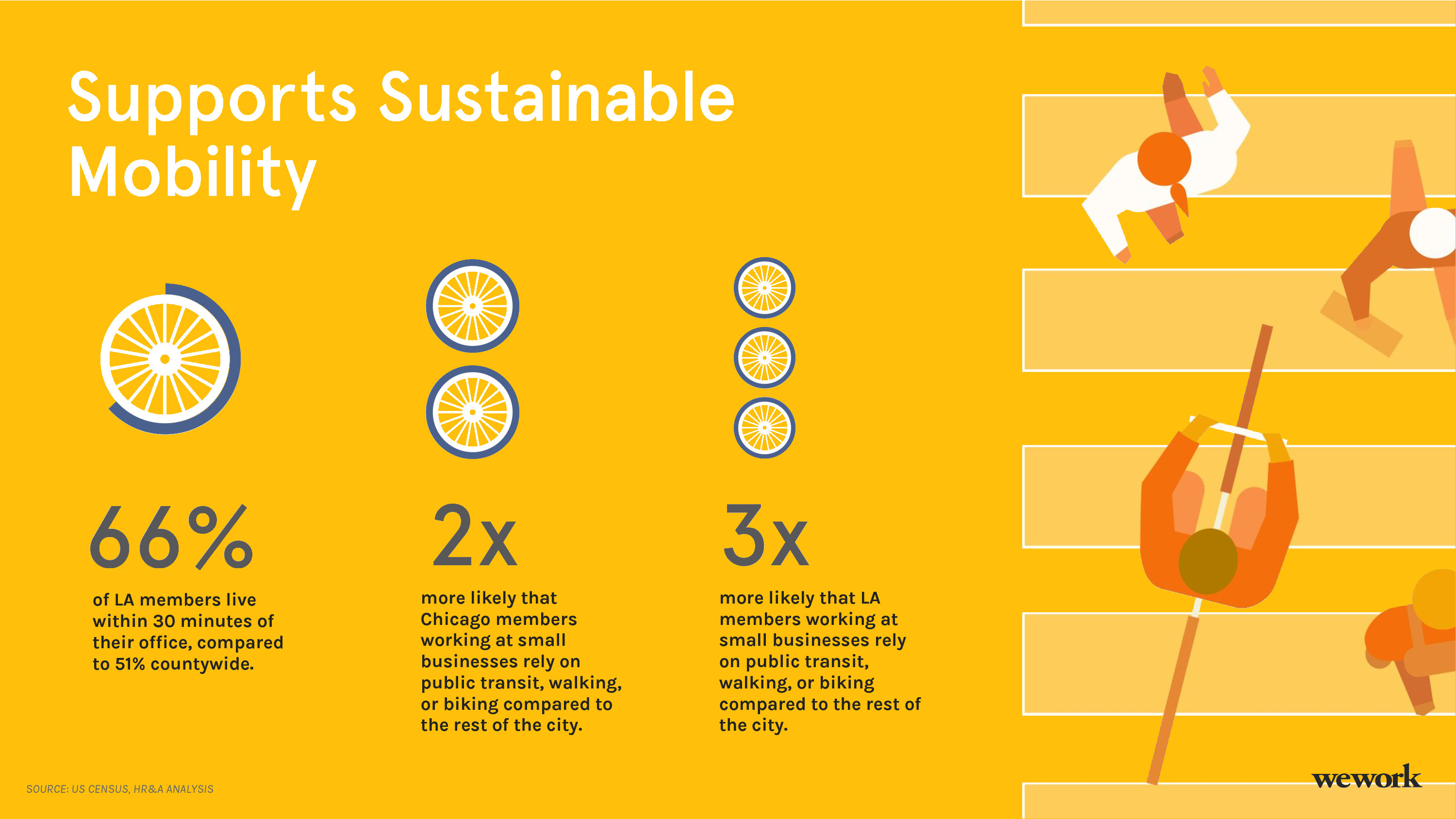 遍布城市的灵活的办公地点成为人们灵活地选择理想的工作场所的最佳方式,还能减少上下班的时间。很多小企业成员依赖公共交通、步行或骑自行车,超过66%的人生活在离办公室30分钟的范围内。