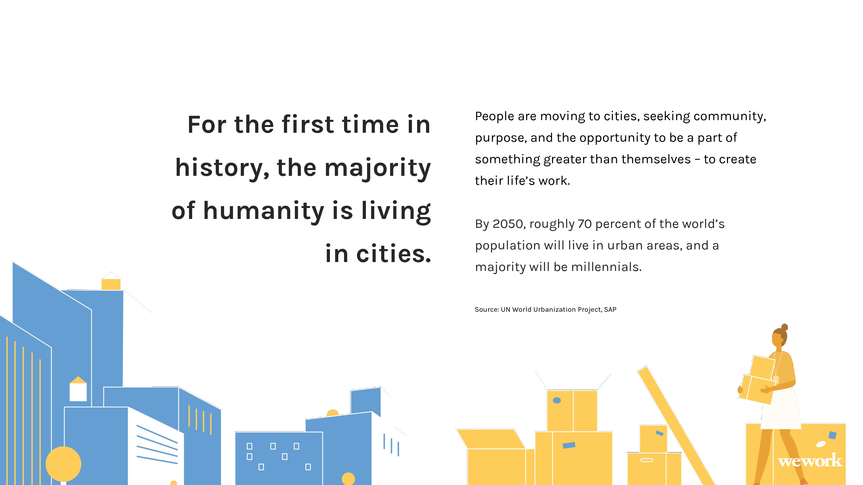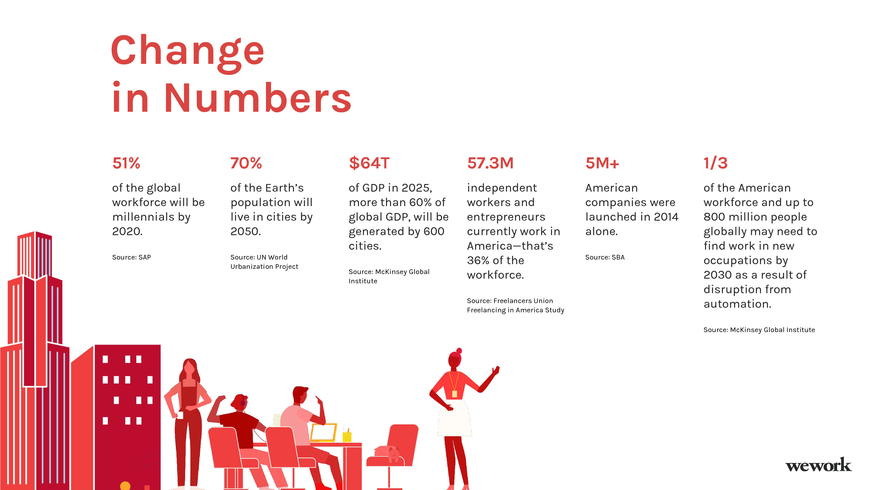 WeWork发布了新报告“2018年经济影响报告”。城市正在发生变化,找工作、生活和娱乐场所的年轻人正在向大大小小的城市迁移。到2050年,约70%的世界人口将住在市区,大部分是千禧一代。到2025年全球600个城市为GDP贡献60%。目前,美国有5730万独立工作者,占劳动力的36%。