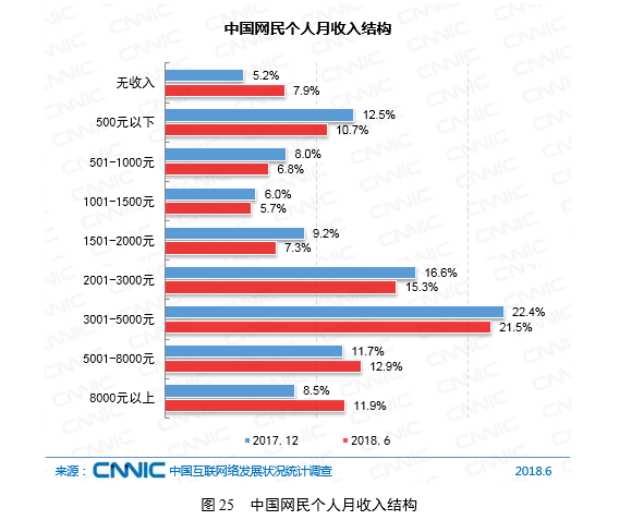 月收入在2000-5000元的网民群体占比较高。截至2018年6月,月收入在2001-3000、3001-5000元的群体占比分别为15.3%和21.5%。2018年上半年,无收入人群和高收入人群占比有所提升,无收入网民占比较2017年末提升2.7个百分点,而月收入在5000元以上的网民占比较2017年末增长4.5个百分点。