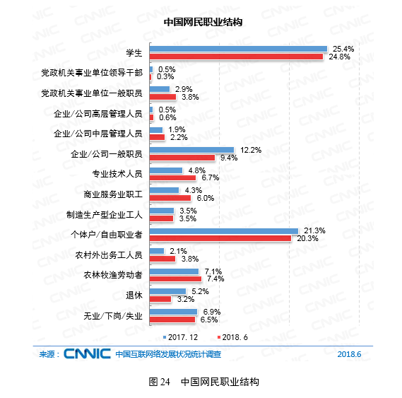 截至2018年6月,中国网民中学生群体最多,占比达24.8%;其次是个体户/自由职业者,占比为20.3%;企业/公司的管理人员和一般职员占比共计12.2%。我国网民职业结构保持稳定。