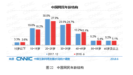 我国网民以青少年、青年和中年群体为主。截至2018年6月,10-39岁群体占总体网民的70.8%。其中20-29岁年龄段的网民占比最高,达27.9%;10-19岁、30-39岁群体占比分别为18.2%、24.7%,与2017年末基本保持一致。30-49岁中年网民群体占比由2017年末的36.7%扩大至39.9%,互联网在中年人群中的渗透加强。