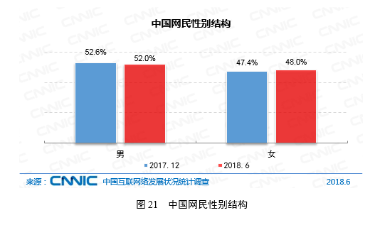 截至2018年6月,中国网民男女比例为52.0:48.0;2017年末,中国人口男女比例为51.2:48.8 。中国网民性别结构与人口性别属性趋同。