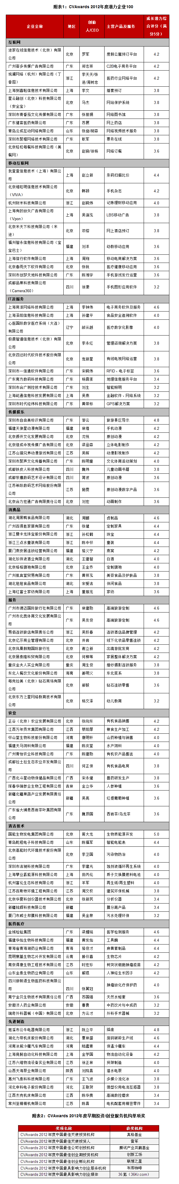 与往届潜力企业榜单有所不同,“CVAwards 2012年度最具潜力企业100”更加注重榜单评选过程与结果的专业性与实用性,最终名单以十个国内主流投资机构重点关注的行业为维度,按互联网、移动互联网、消费品、服务、传媒娱乐、农业、IT技术、医药医疗、先进制造、清洁技术等十行业最具潜力企业TOP10进行发布(名单见附表1)。