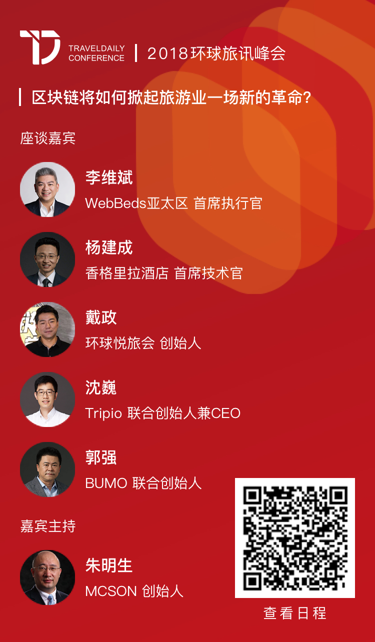 那么,区块链的应用将给旅游业带来什么样的颠覆性变化?作为旅游企业,应如何把握其中的机遇?作为“2018环球旅讯峰会”首日“创新专场”的重磅环节,9月19日峰会现场,WebBeds(WebJet下属的酒店分销平台)亚太区CEO李维斌、香格里拉酒店CTO杨建成、环球悦旅会创始人戴政、Tripio联合创始人兼CEO沈巍、BUMO联合创始人郭强与您一起分享“区块链将如何掀起旅游业一场新的革命”的话题,该环节由MCSON创始人朱明生主持。