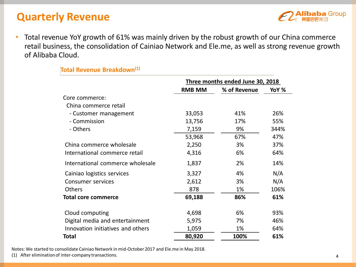 阿里巴巴集团CFO武卫对此表示:“我们又收获了一个出色的季度,集团总收入增长达61%,不计一次性项目的影响,季度盈利增长强劲。很高兴在如此巨大的规模体量下,我们的业务依然能够展现优势、快速成长。集团各个主要业务板块,包括核心电商、云计算及数字媒体和娱乐的卓越增长,均印证了我们面向未来的客户体验、产品、技术及基础设施的投资战略。通过为企业客户、合作伙伴及消费者带来独特的价值,我们有信心能够继续扩大自身的市场领先地位。”