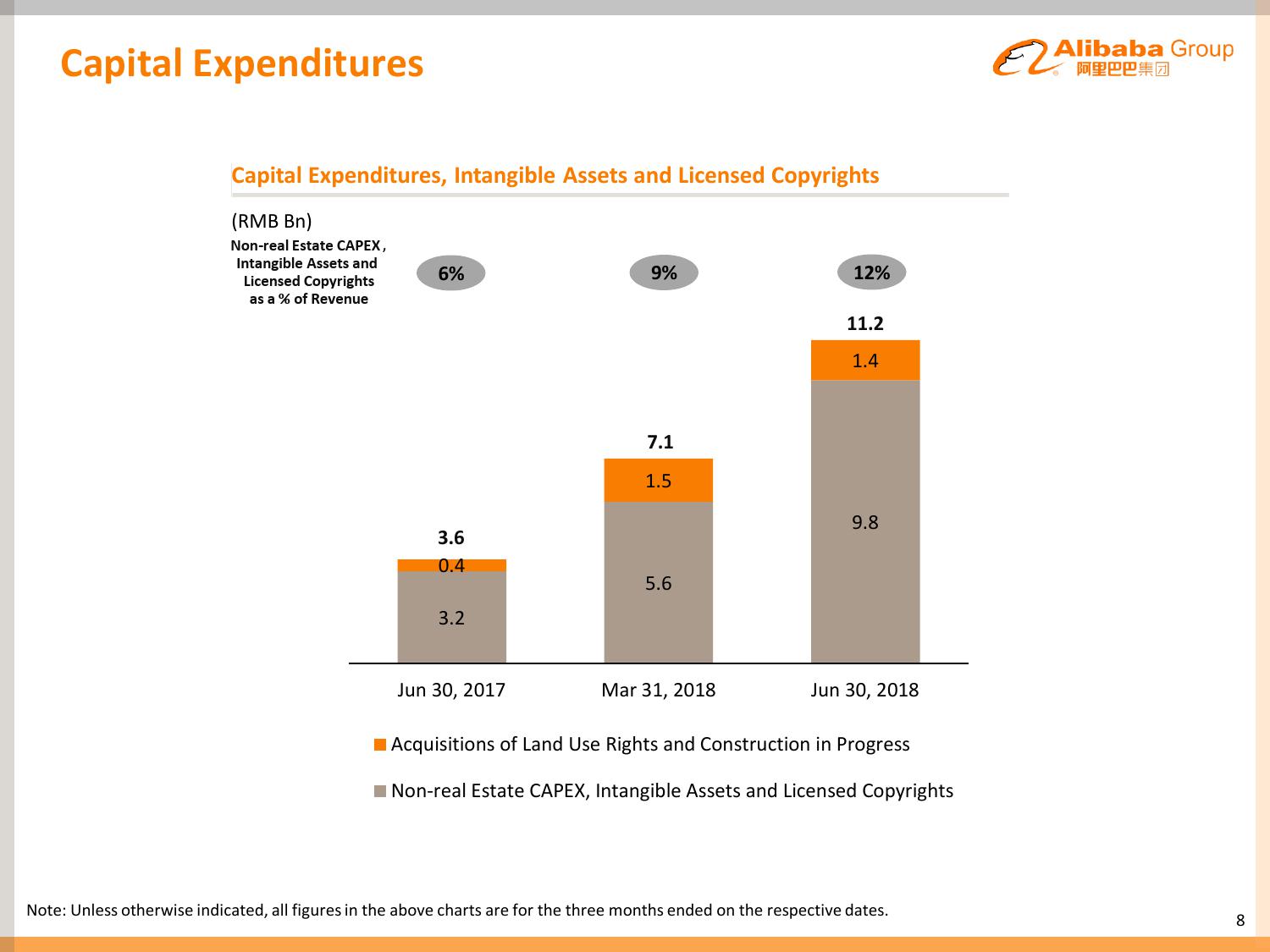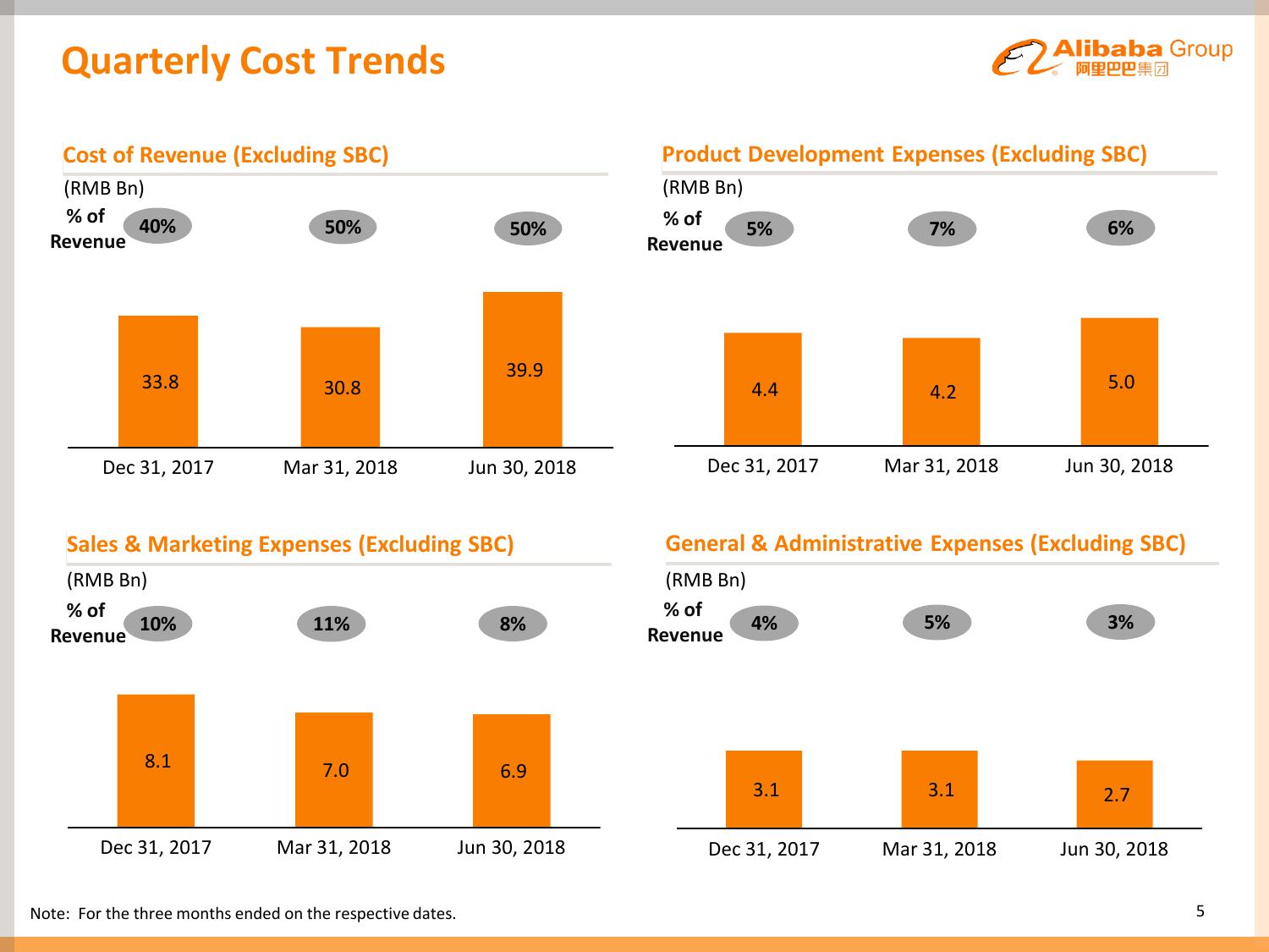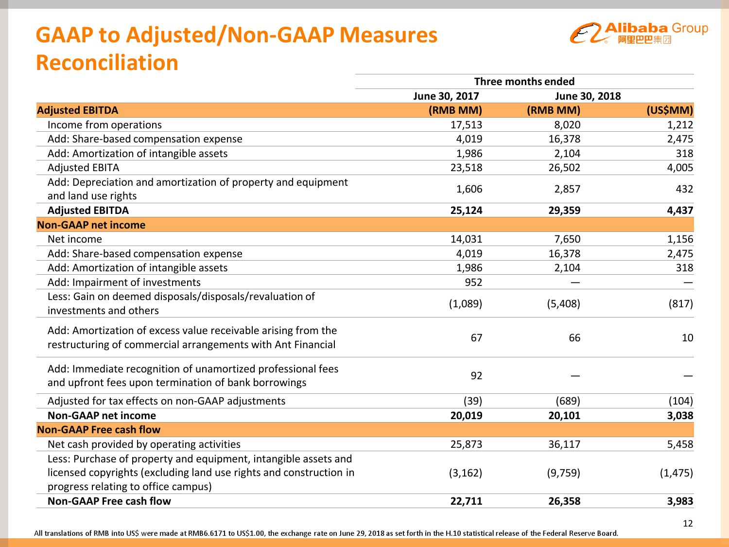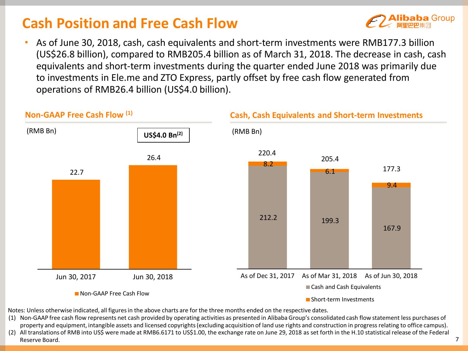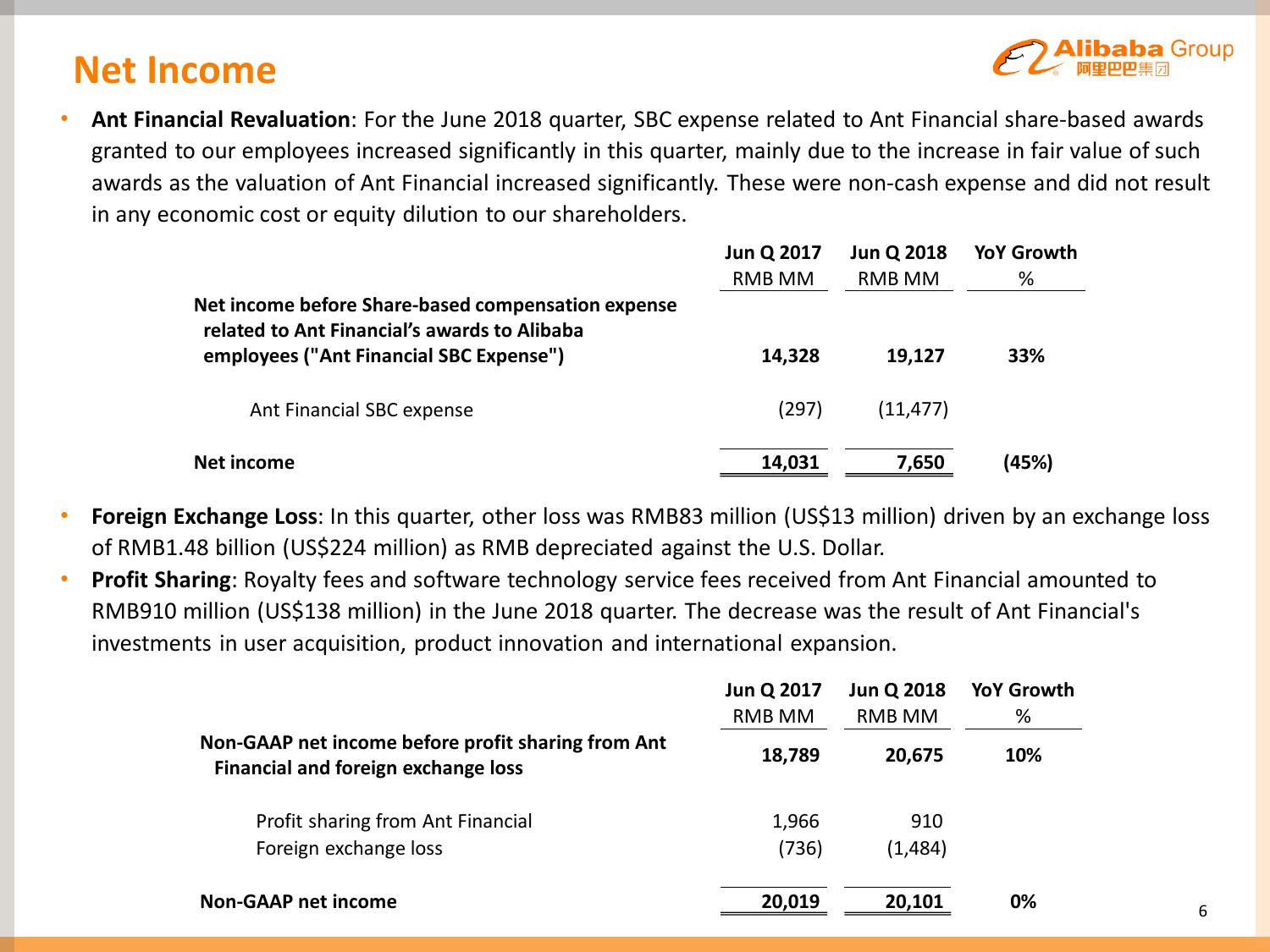 非美国通用会计准则下盈利达到201.01亿元,同时,由于蚂蚁金服估值大幅增加,授予员工的蚂蚁金服相关股权奖励非现金开支达到111.8亿,员工股权奖励总开支达到了历史新高——163.78亿,导致美国通用会计准则下的季度盈利为76.50亿元,撇除蚂蚁金服相关的股权奖励开支影响,本季度盈利将同比强劲增长33%。本季自由现金流为263.58亿元。