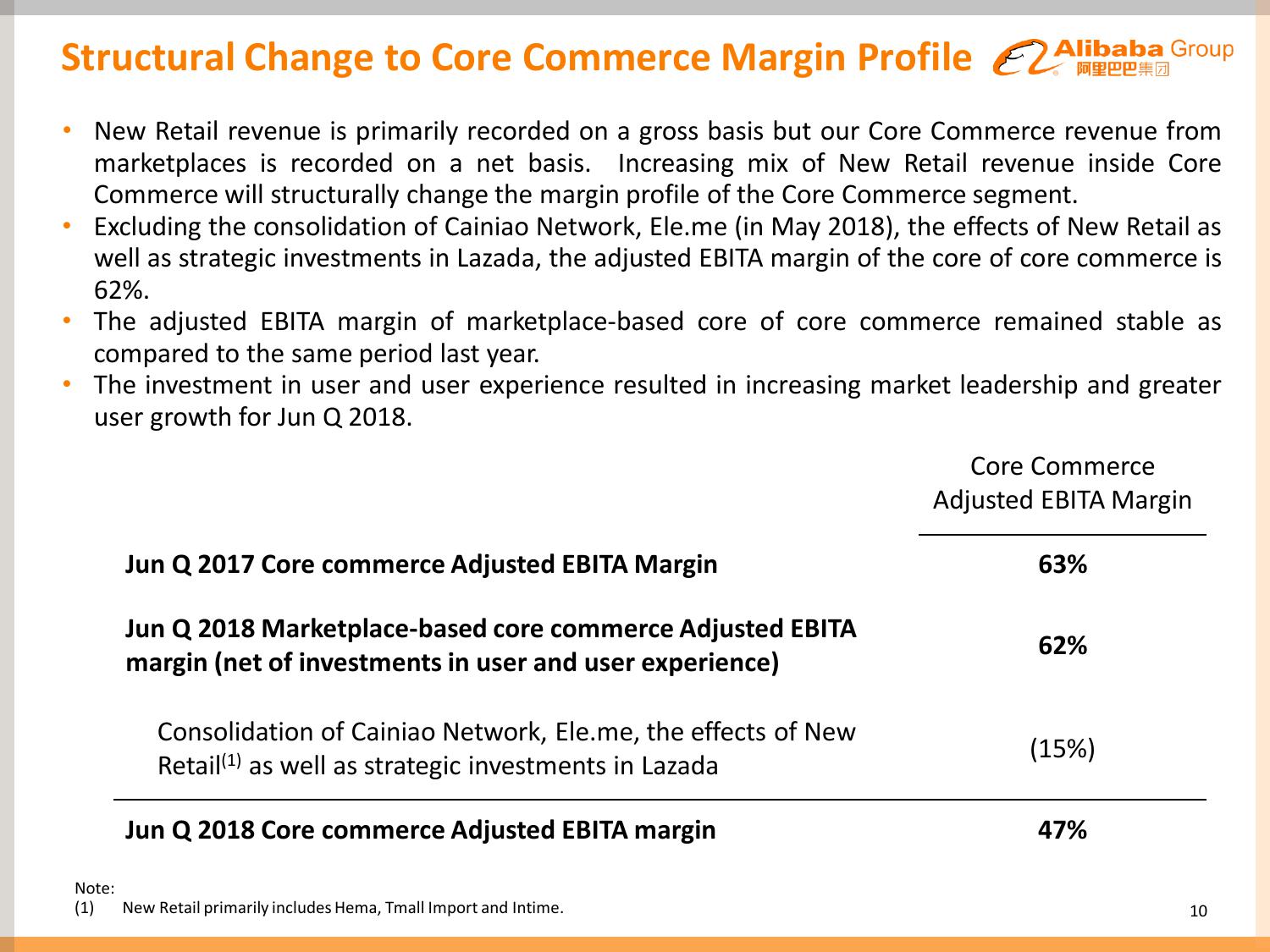 经调整EBITA(息税摊销前利润)为265.02亿元,核心电商业务经调整EBITA为327.97亿元,同比增长22%,超出分析师预期。核心电商调整后EBITA利润率为47%,不计菜鸟网络和饿了么的并表(2018年5月中),以及对新零售业务和Lazada的投资,核心电商业务的经调整EBITA利润率同比保持稳定。