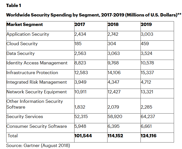 根据Gartner的最新预测,2018年全球信息安全产品和服务支出将超过1140亿美元,比去年增长12.4%。预计2019年市场还将增长8.7%,达到1240亿美元。