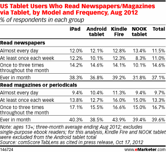 comScore 8月份发现,每个月有超过1/3的美国平板电脑用户在平板上阅读新闻,更多比例的人在阅读杂志。Kindle fire用户的阅读率稍高,iPad用户在这两类内容上位于第二位。Nook和其他安卓设备在阅读杂志和报纸上的水平稍微低于平均
