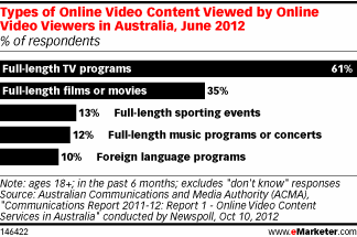 根据Australian Communications and Media Authority (ACMA)6月份发布的数据,澳大利亚网络视频用户最常看的视频节目是电视剧,高达61%,然后是电影,为35%,体育赛事,音乐和演唱会节目也有10%左右的观众观看,而外语节目的也有10%