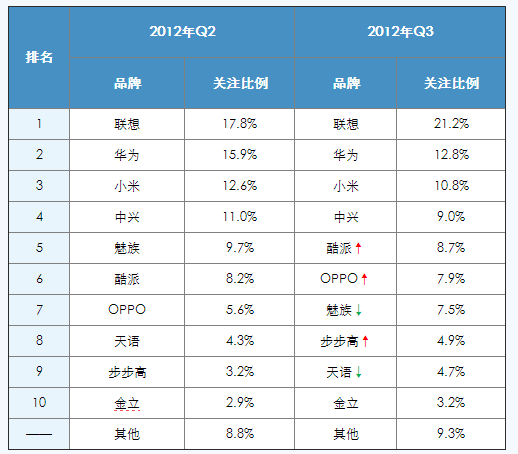 表 2012Q2-2012Q3中国国产手机市场品牌关注比例对比