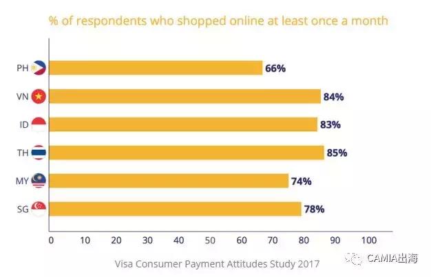 越来越多的越南消费者在使用电子商务,他们是东南亚最常见的在线购物者之一。根据《2017年签证消费者支付态度研究报告》显示,在五百多名越南受访者中,84%的人说他们每个月至少在网上购物一次,仅次于泰国85%。