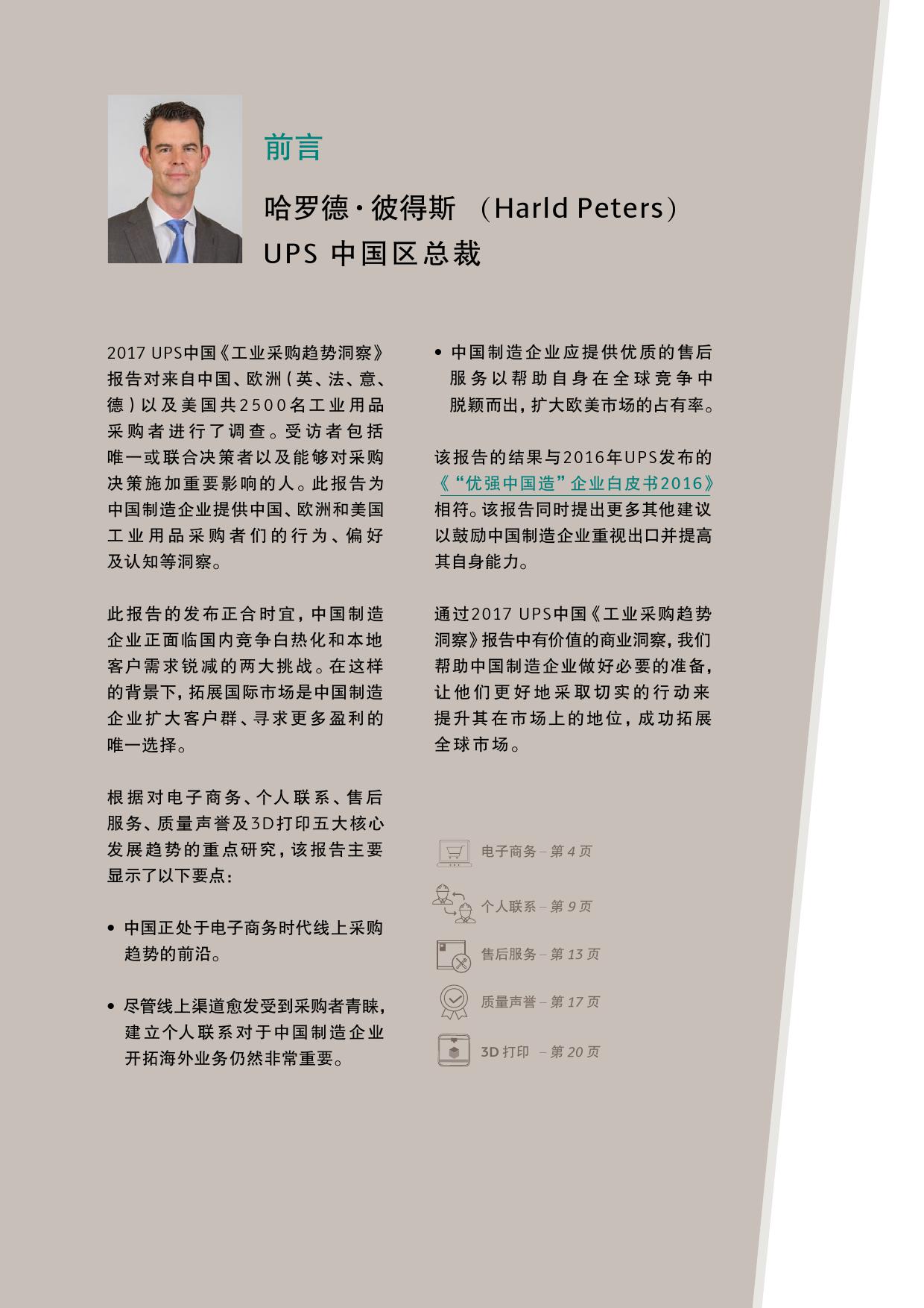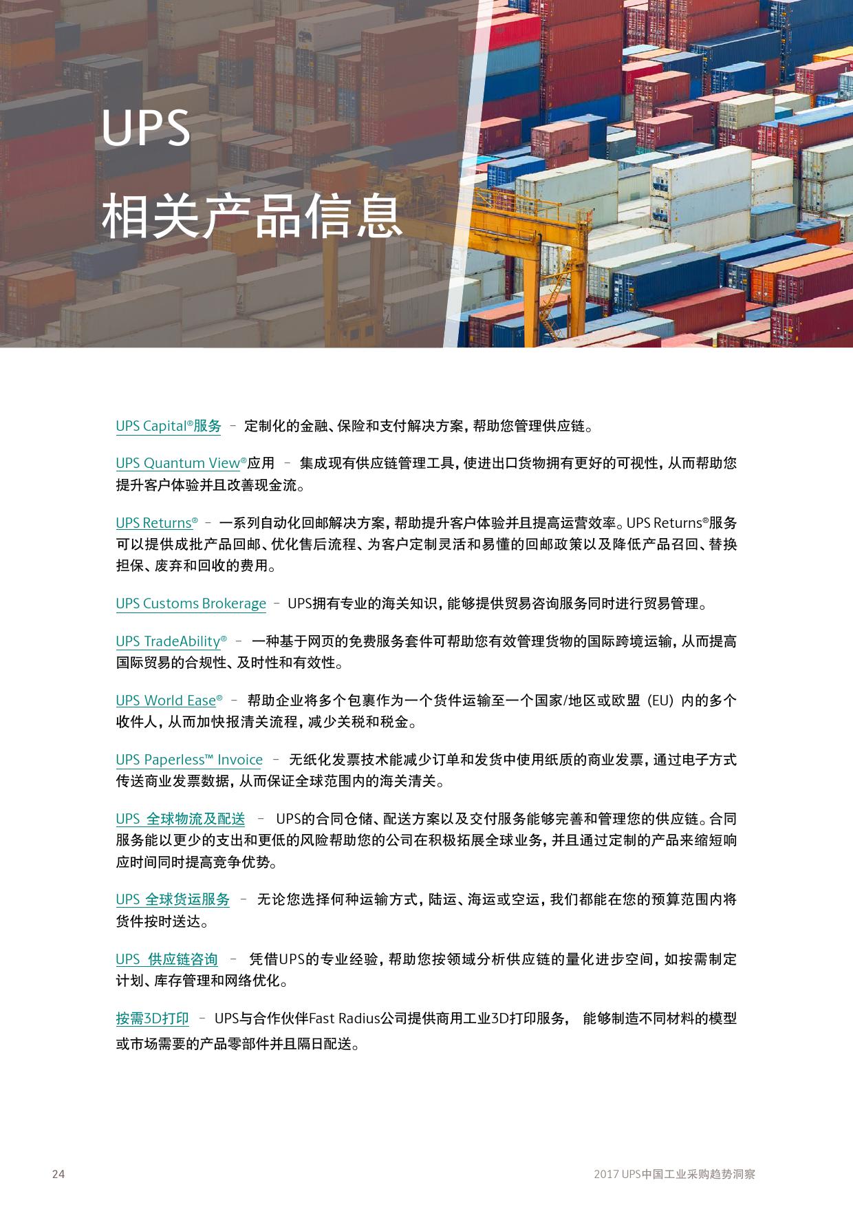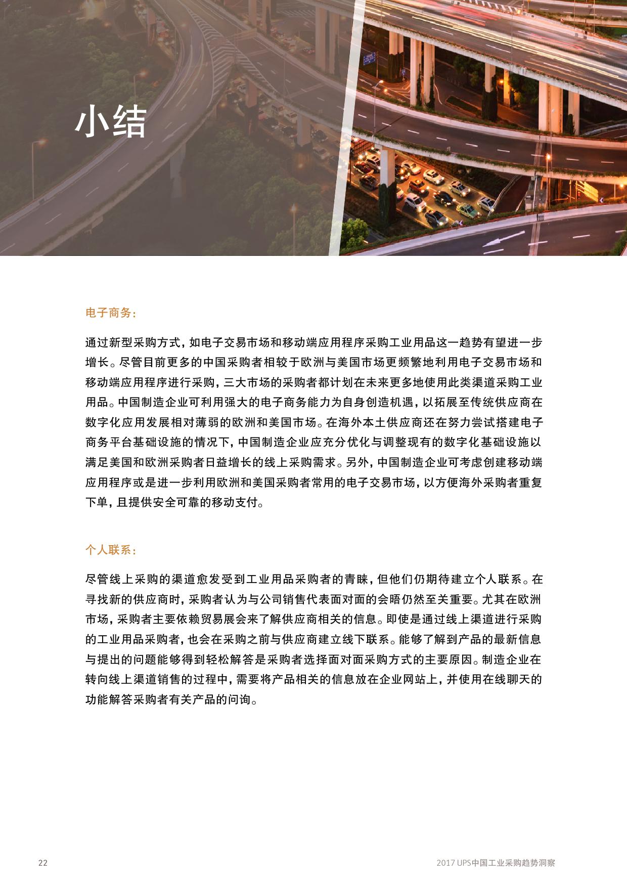 该报告同时提出更多其他建议以鼓励中国制造企业重视出口并提高其自身能力。UPS《工业采购趋势洞察》报告重点调查了电子商务、个人联系、售后服务、质量声誉以及3D打印这五大核心发展趋势。这些趋势对于希望拓展海外业务并加强运营策略的中国制造企业来说是至关重要的。