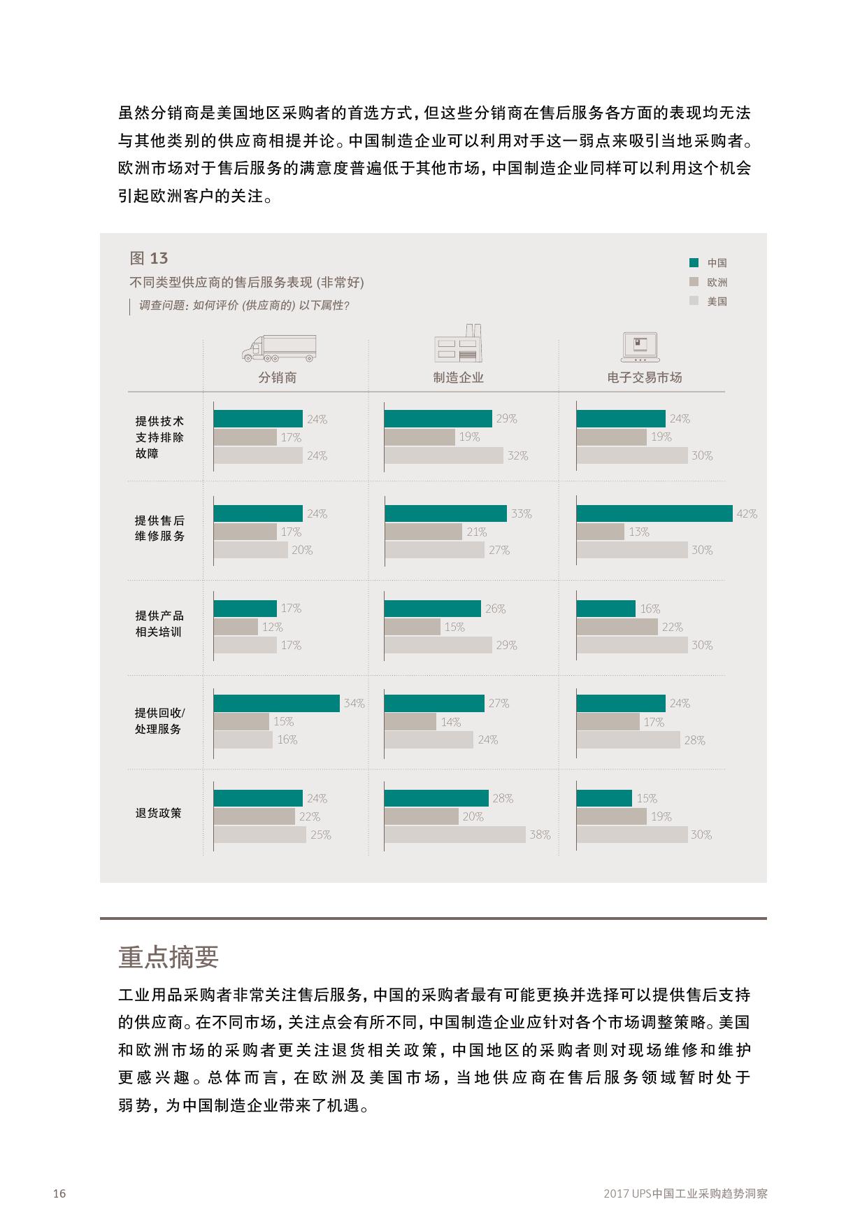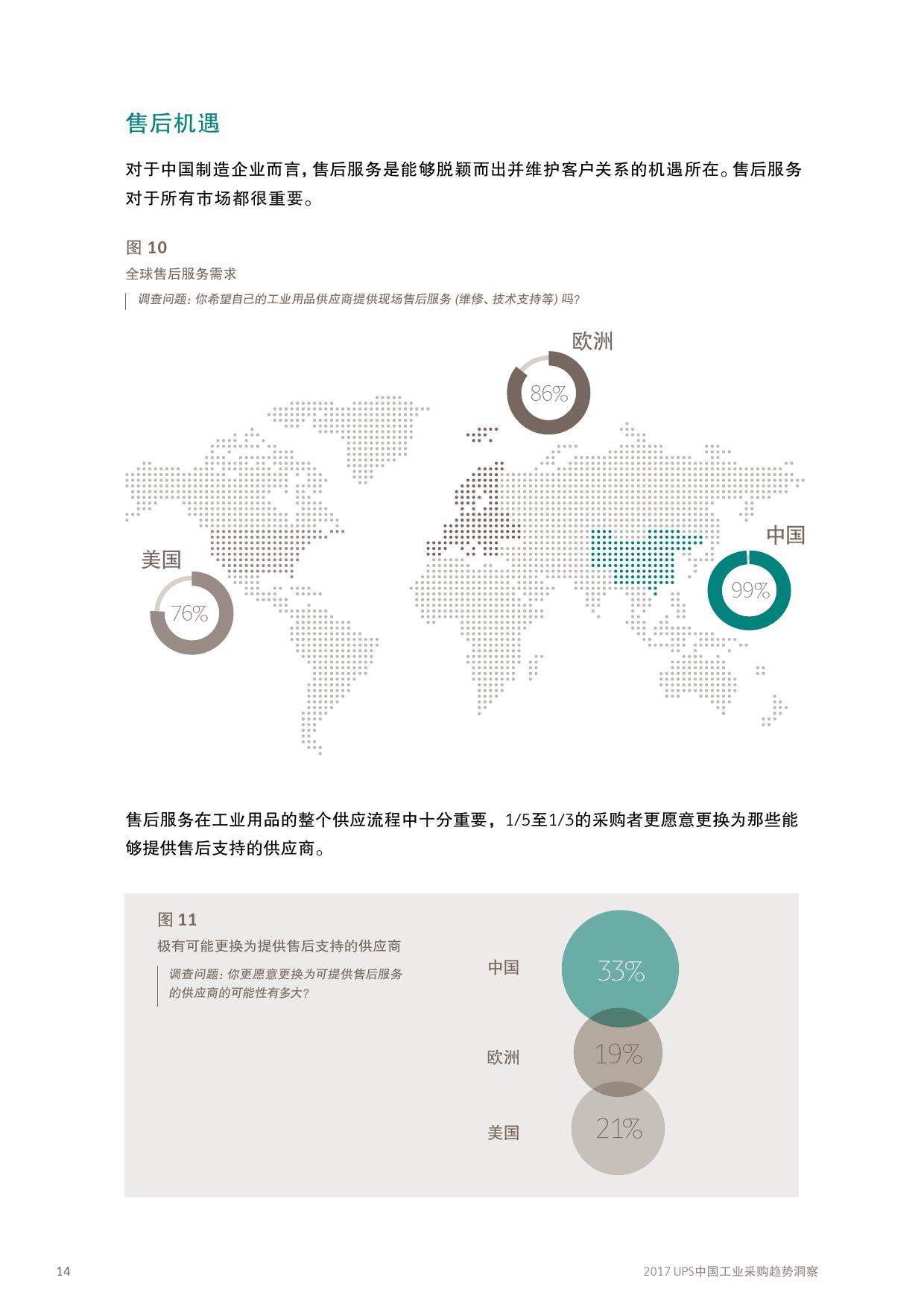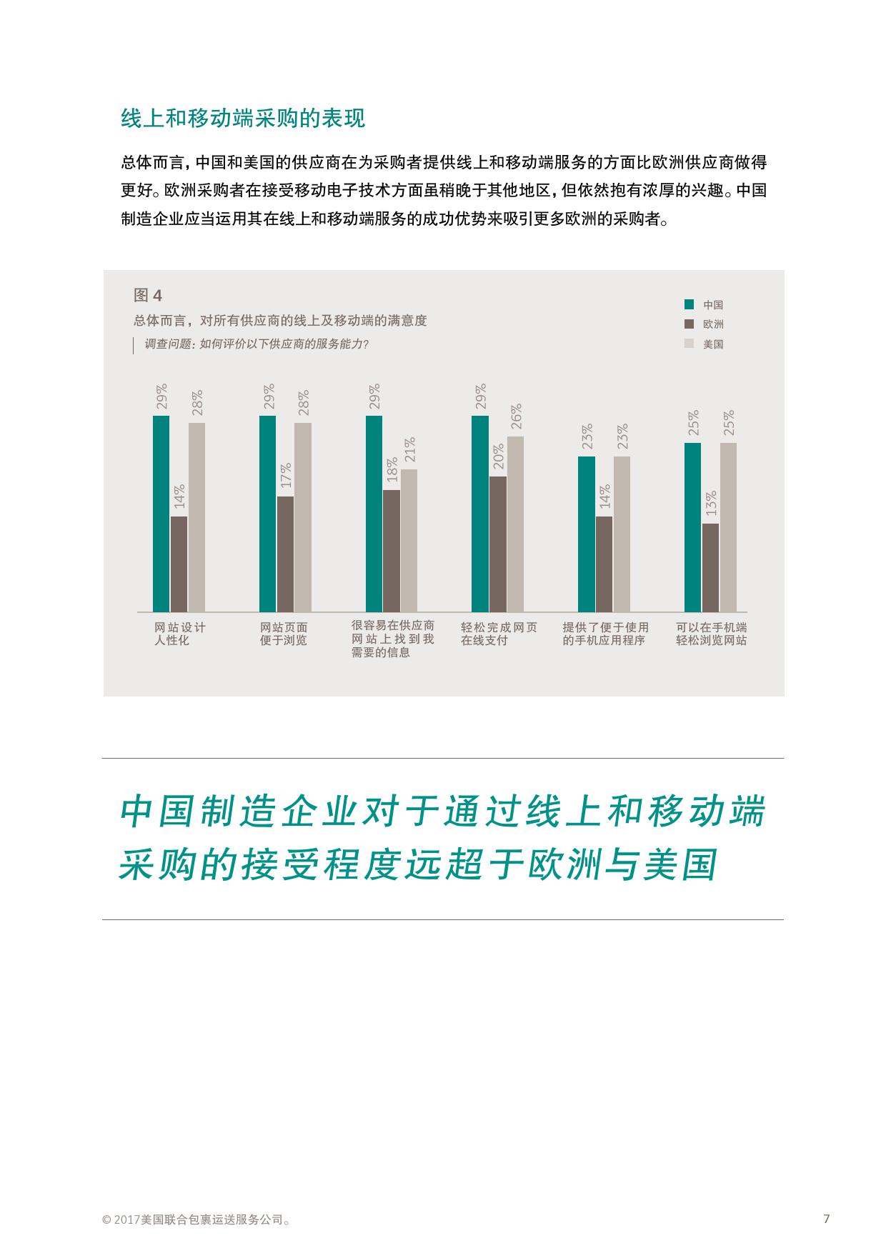 报告结果显示,在线上和移动客户端应用上,中国已赶超美国和欧洲。这个结果印证先前的情况:传统意义上的个人联系仍很重要,通过电子交易市场和移动端采购的人数在三个调查市场中也将不断增长。提供售后服务在所有市场中都是非常必要的,其中欧洲与美国的采购者最为关注产品的退货服务。