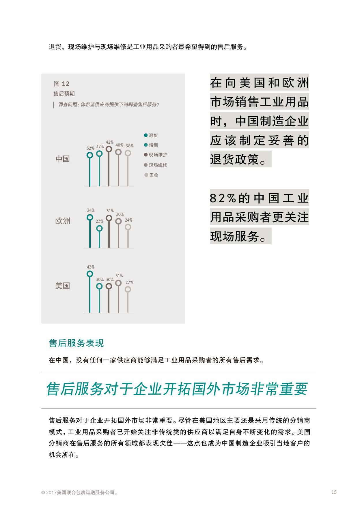 - 提供优质的售后服务是中国制造企业们脱颖而出的机会。所有市场的工业用品采购者都认为售后服务非常重要并希望供应商能够提供售后服务,尤其是中国的采购者,该比例高达99%。86%的欧洲采购者以及76%的美国采购者希望供应商提供在场售后服务,例如现场维护、修理以及培训等。其中,约五分之一到三分之一的全球采购者表明,他们极有可能会转投那些提供售后支持的供应商。相应的,34%的欧洲采购者和43%的美国采购者们非常看重高质量的退货服务。方便的退货政策、满足客户售后服务的其它需求能够帮助中国制造企业们在竞争中脱颖而出并扩大全球市场占有率。