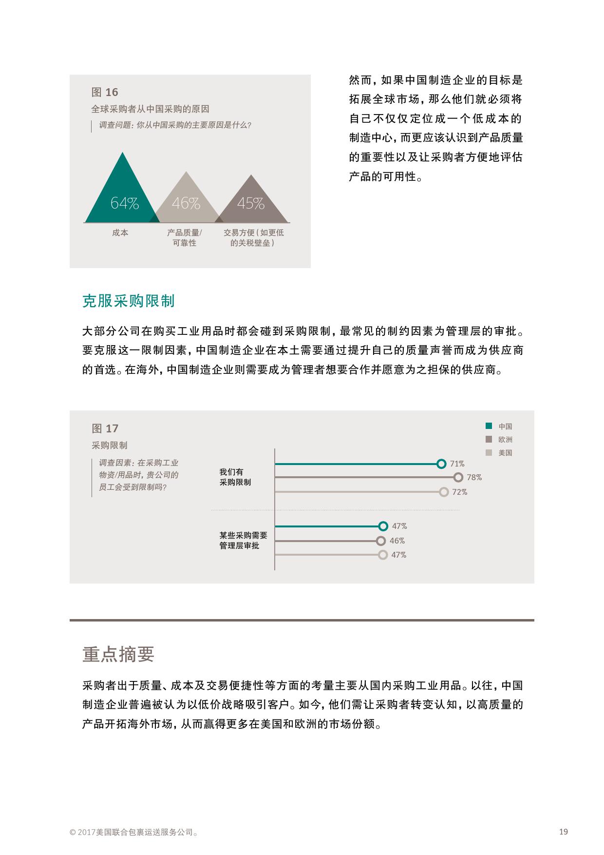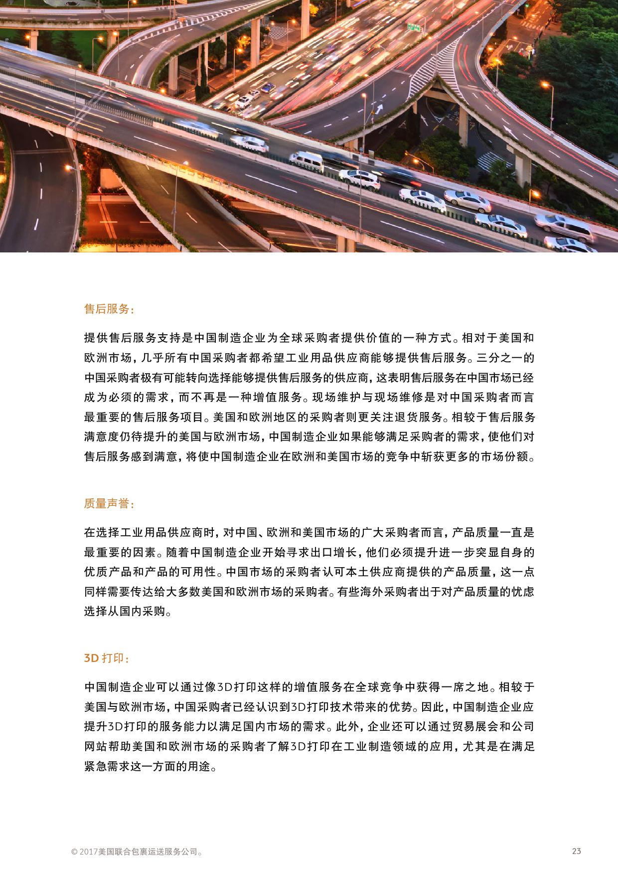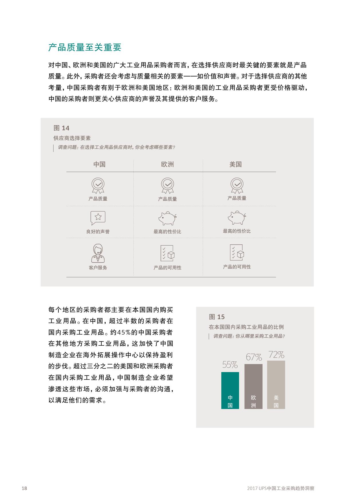 - 不论在中国还是欧美市场,影响工业用品采购者选择供应商最重要的因素是产品质量。除此之外,声誉、用户服务等因素也非常重要。中国工业用品采购者选择从国内采购产品的考量包括成本(64%)、产品质量(46%)以及交易便利(45%)。中国制造企业在不断发展增值服务的同时,必须要提升采购者对自己产品质量的认知以增加欧美市场份额。