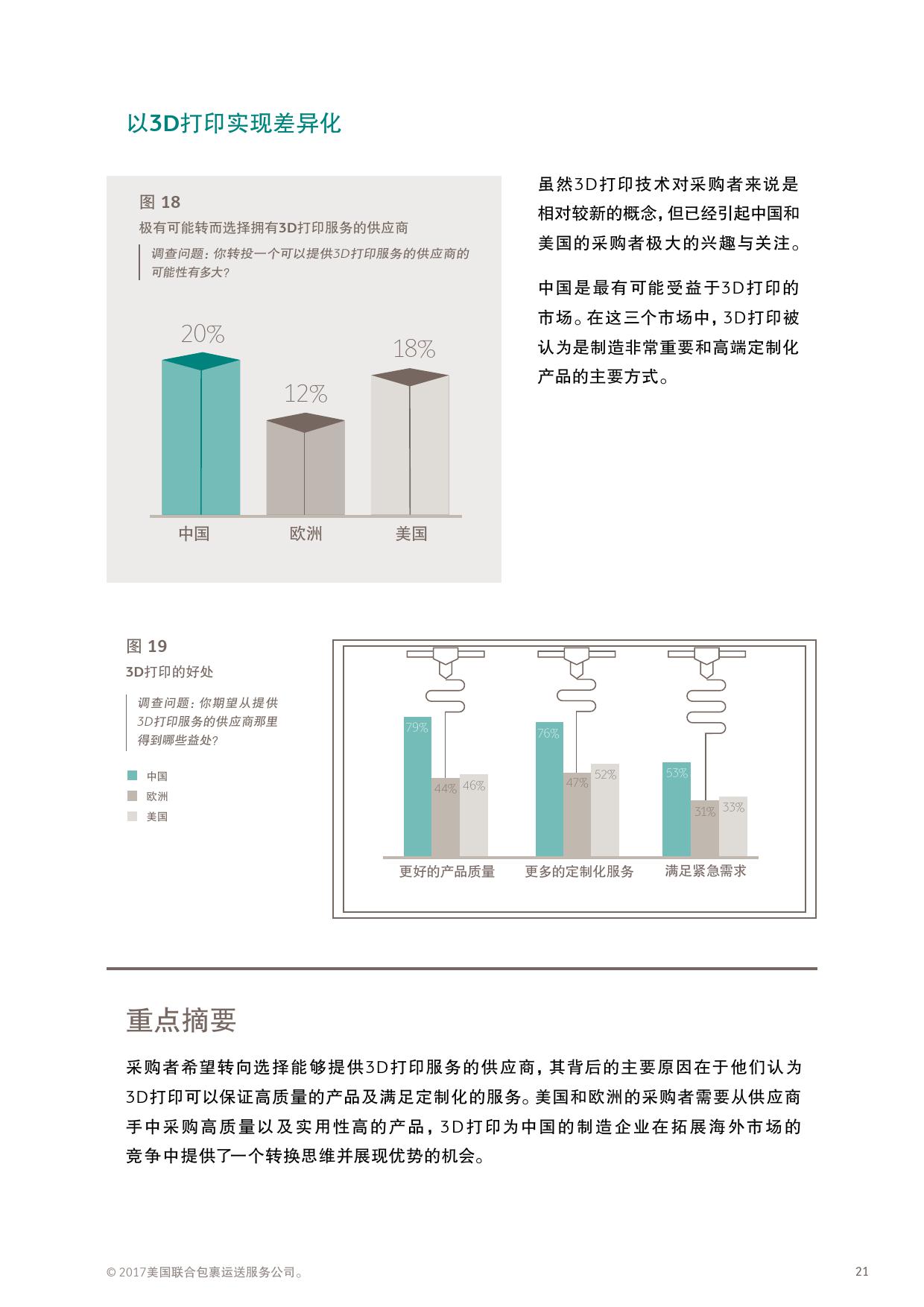 - 中国制造企业可以通过像3D打印这样的增值服务让自己在竞争中脱颖而出。3D打印主要被视为获取定制化高质量产品的一种途径,中国制造企业可以运用3D打印技术来提升自身的竞争力。