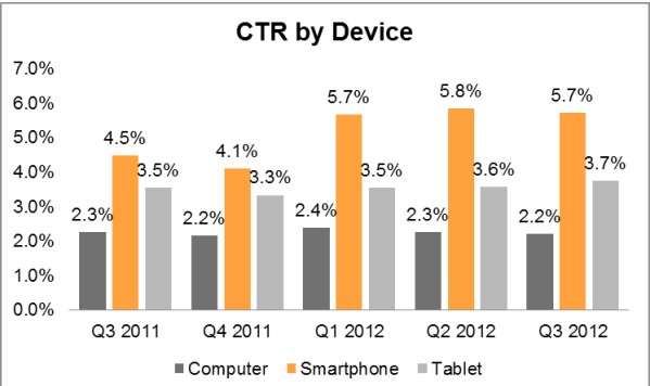 Search Agency的报告基于使用搜索广告工具的客户的数据,显示智能手机的CTR从2011年Q3的4.48%增长至2012年Q3的5.71%