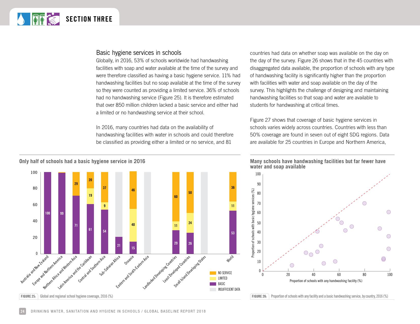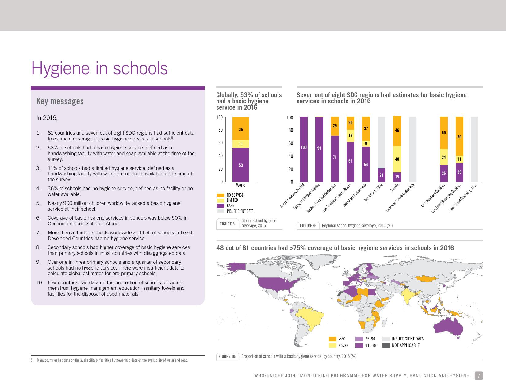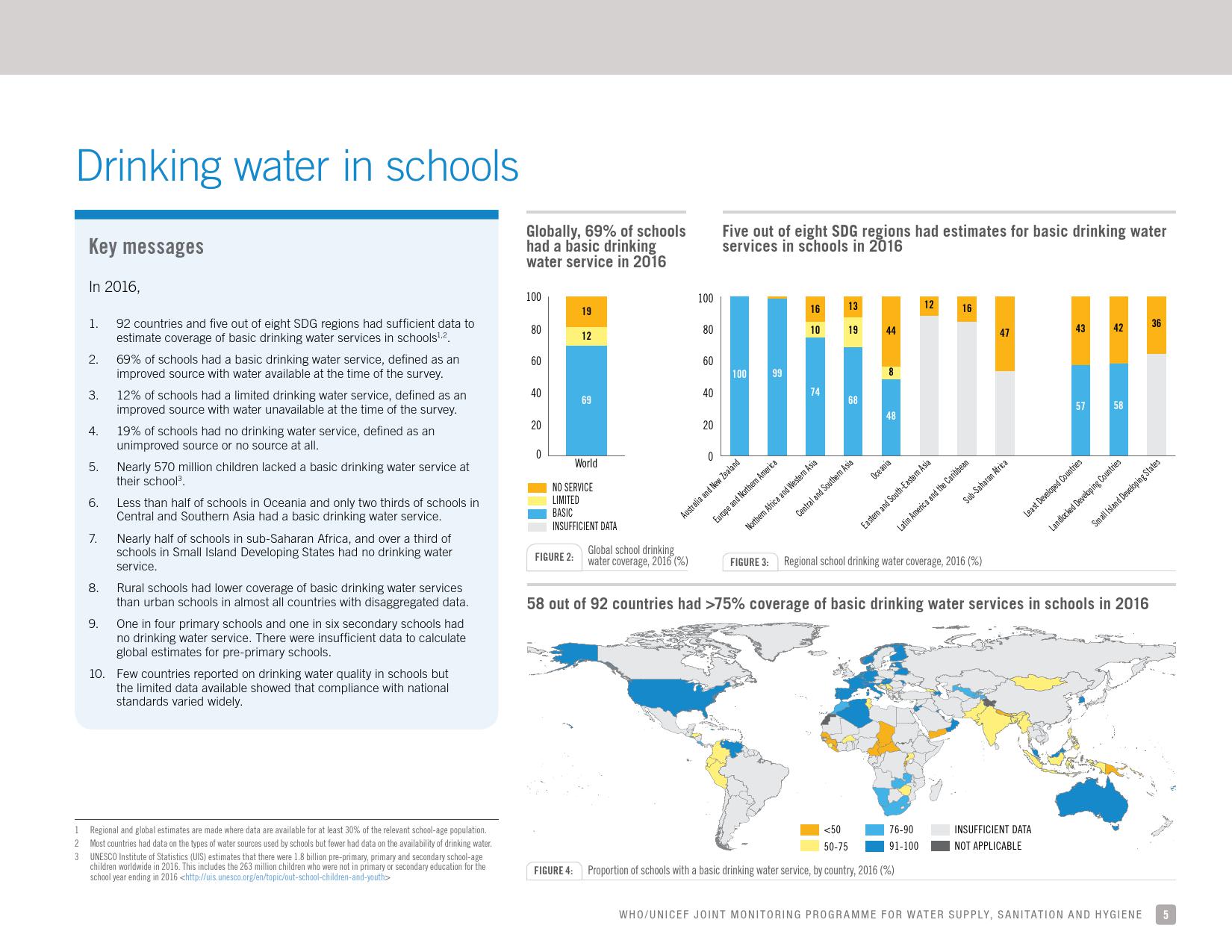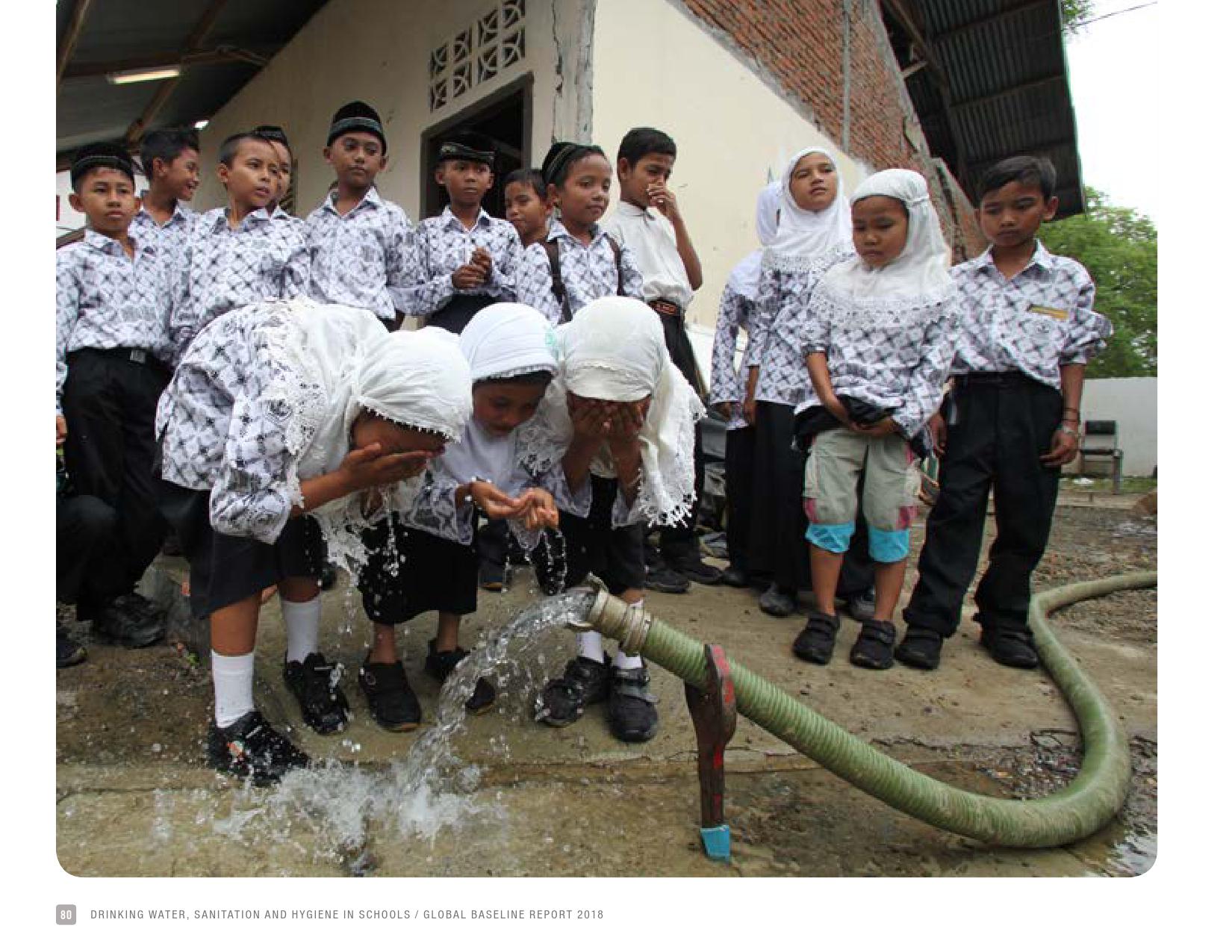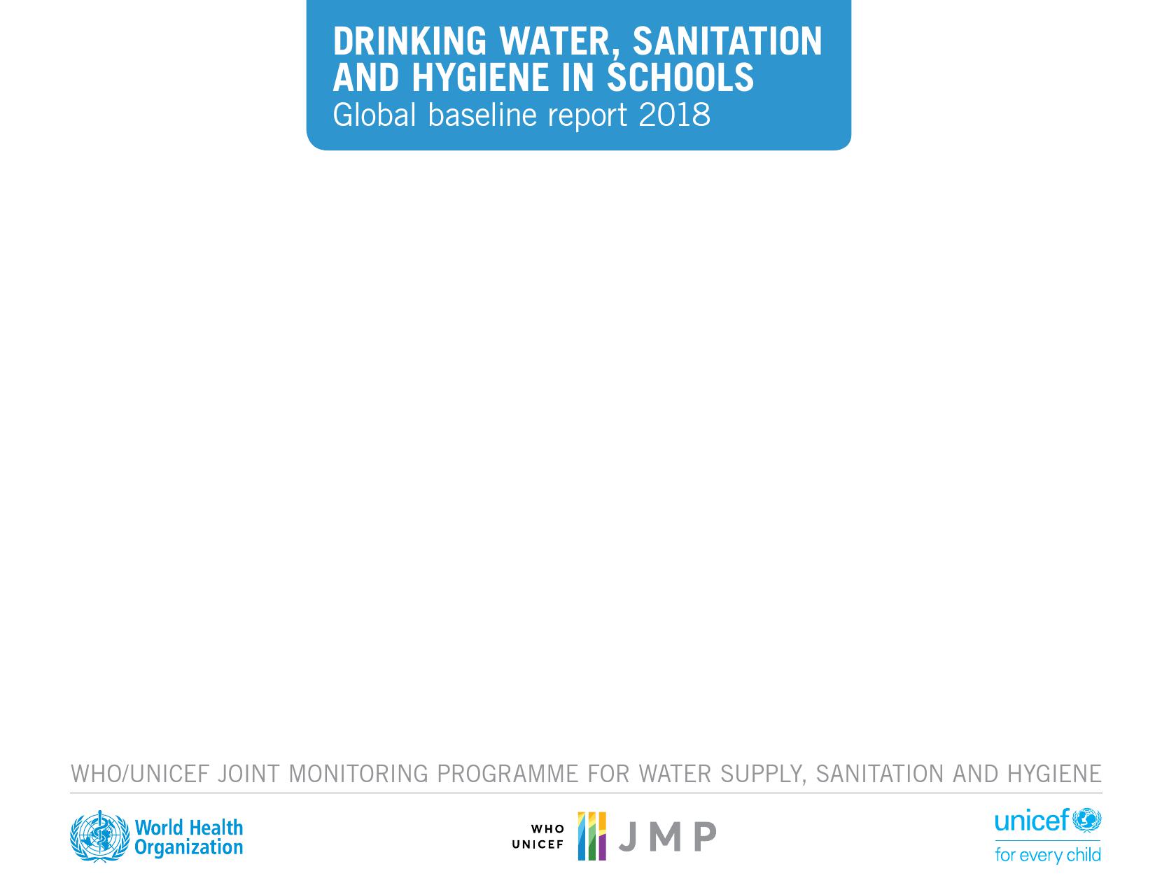 《学校饮用水、如厕卫生和个人卫生: 2018年全球基线报告》显示:全球只有69 %的学校有基本的饮用水服务;四分之一的小学和六分之一的中学没有饮用水服务;将近6亿儿童所在的学校缺乏基本的饮用水服务;大洋洲不到一半的学校和中亚及南亚三分之二的学校具有基本的饮用水服务。