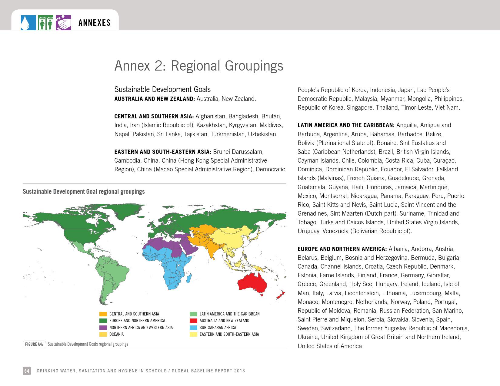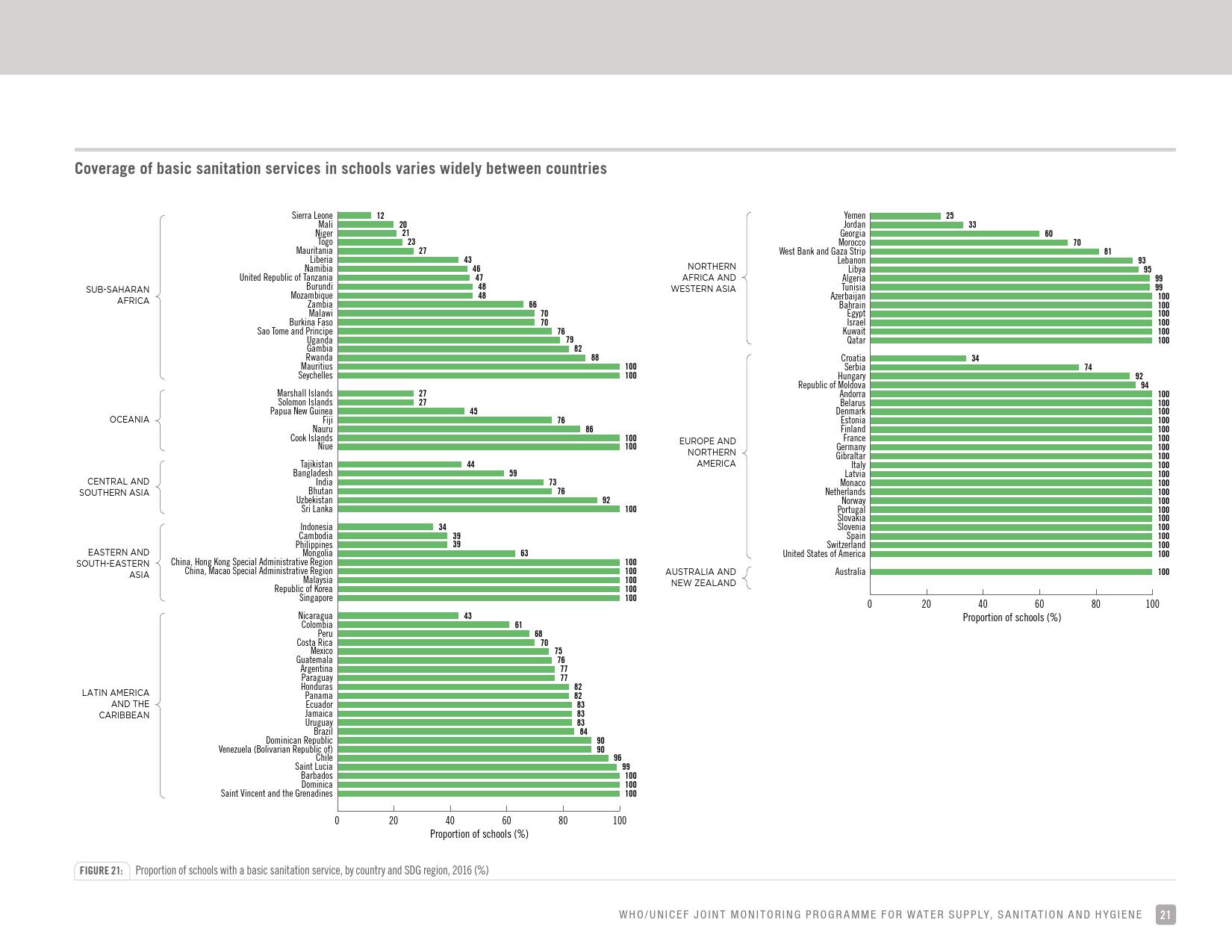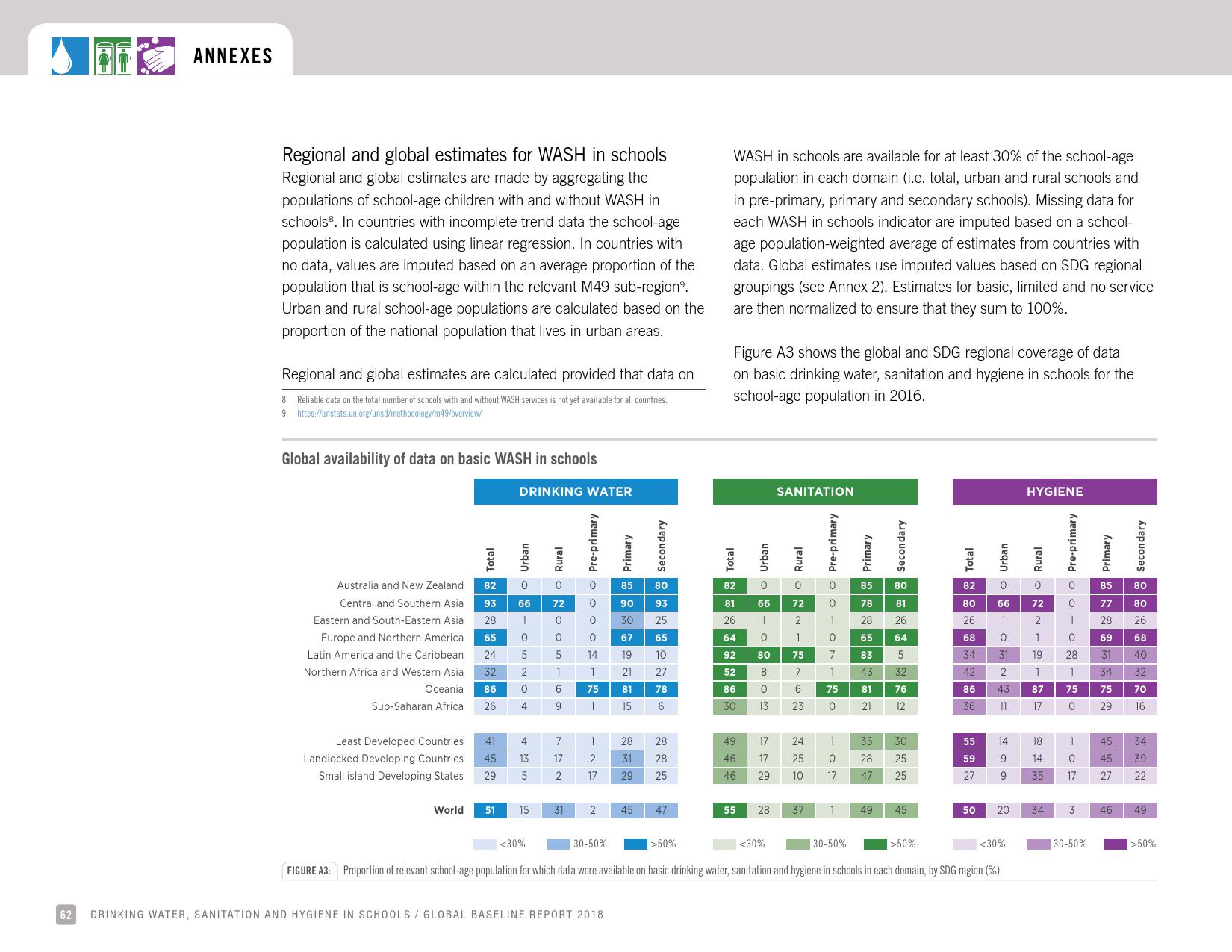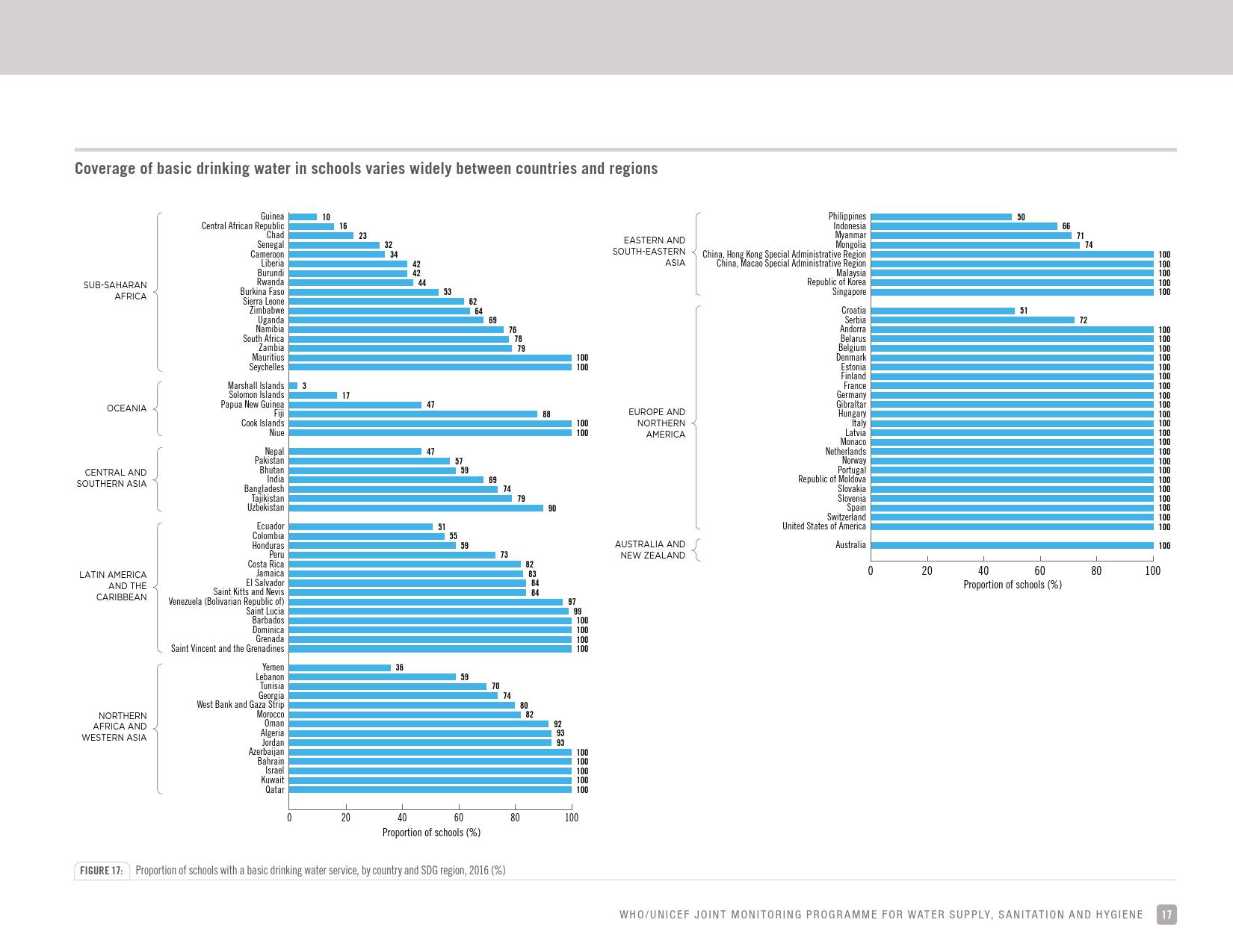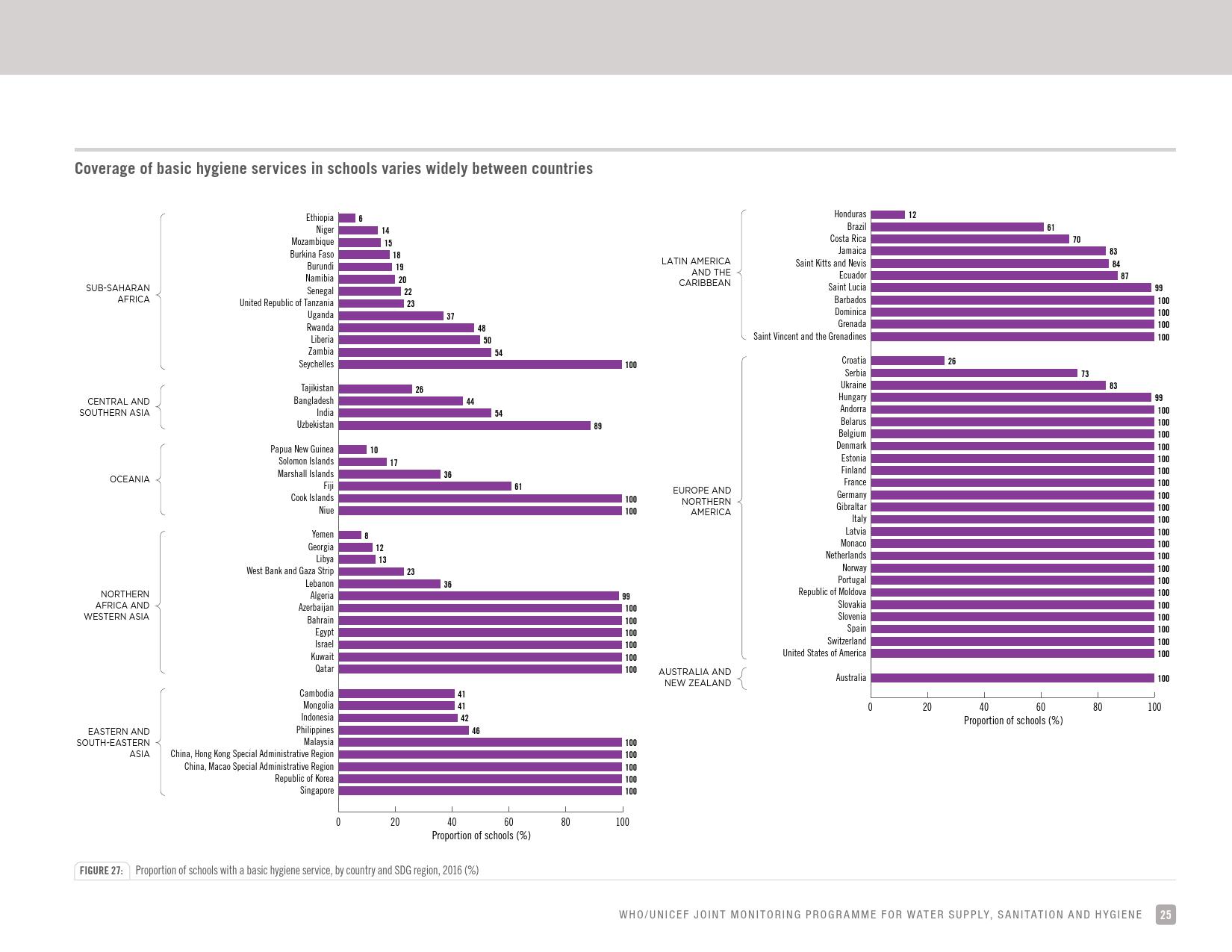 《学校饮用水、如厕卫生和个人卫生: 2018年全球基线报告》显示:全球只有69 %的学校有基本的饮用水服务;四分之一的小学和六分之一的中学没有饮用水服务;将近6亿儿童所在的学校缺乏基本的饮用水服务;大洋洲不到一半的学校和中亚及南亚三分之二的学校具有基本的饮用水服务。