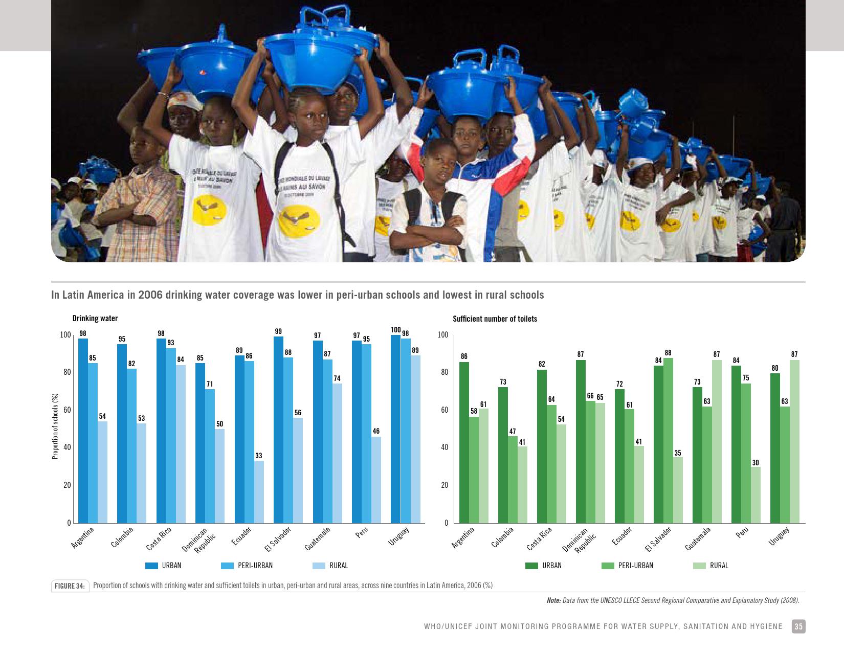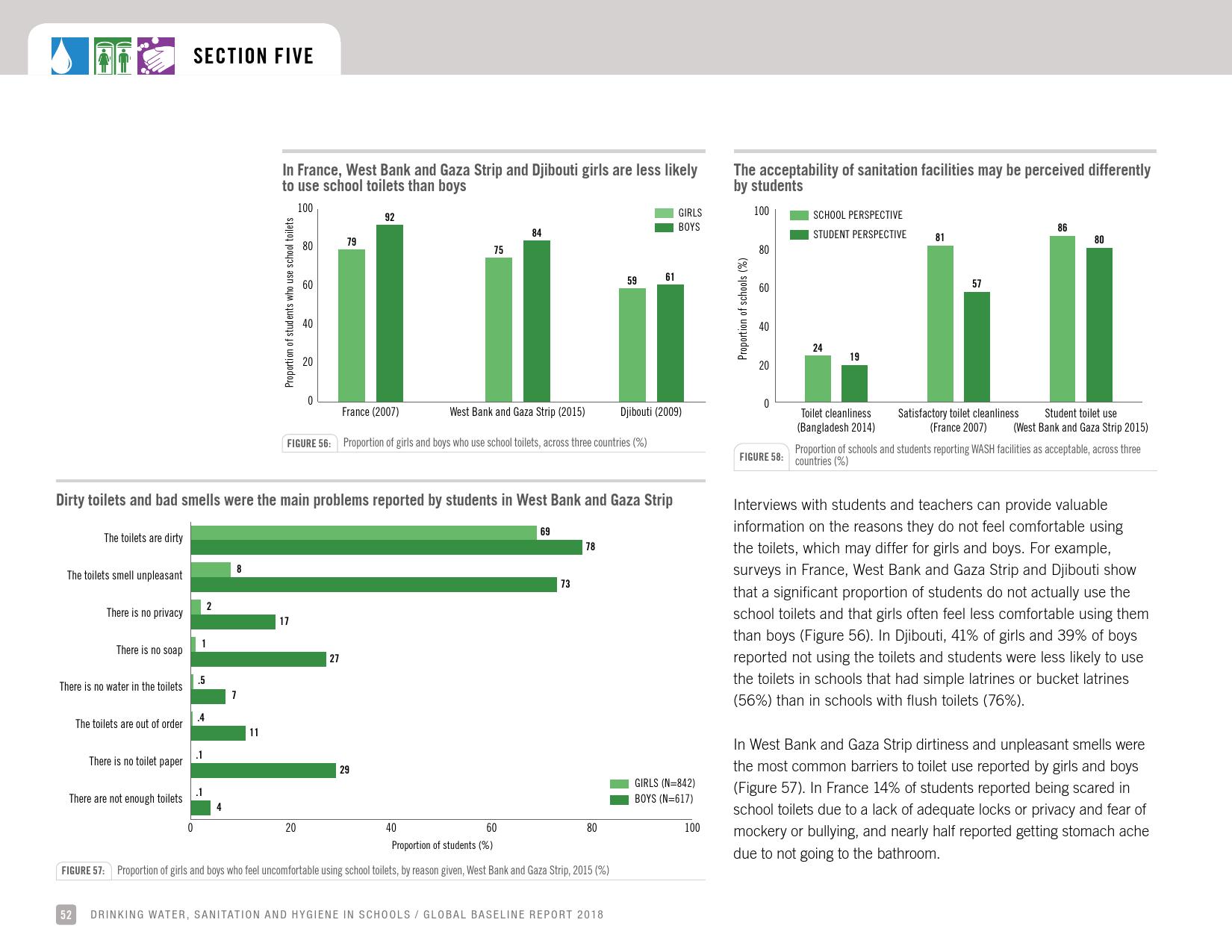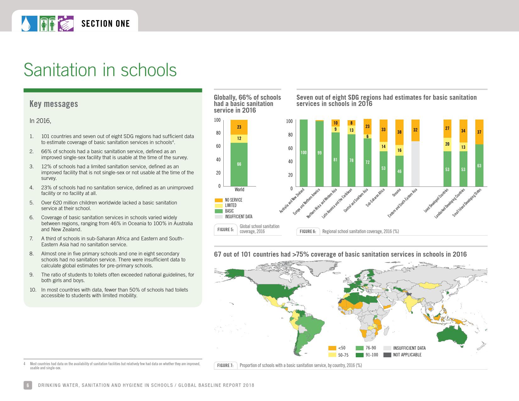 报告显示,全球只有66 %的学校有基本的如厕卫生服务;五分之一的小学和八分之一的中学没有如厕卫生服务。撒哈拉以南非洲和大洋洲三分之一的学校没有如厕卫生服务。在大多数有数据的国家,不到50 %的学校的厕所可供行动能力有限的学生使用。统计显示,全球有6亿在校儿童得不到基本的如厕卫生服务。